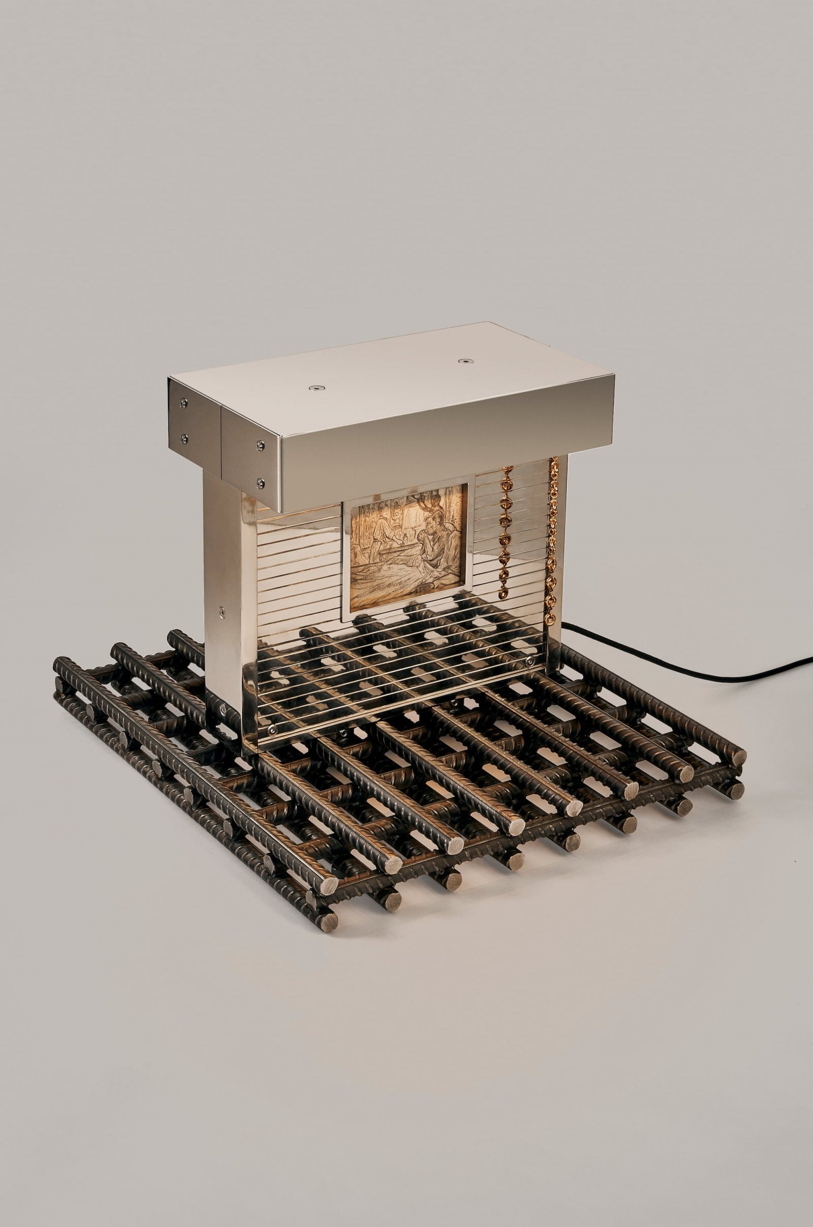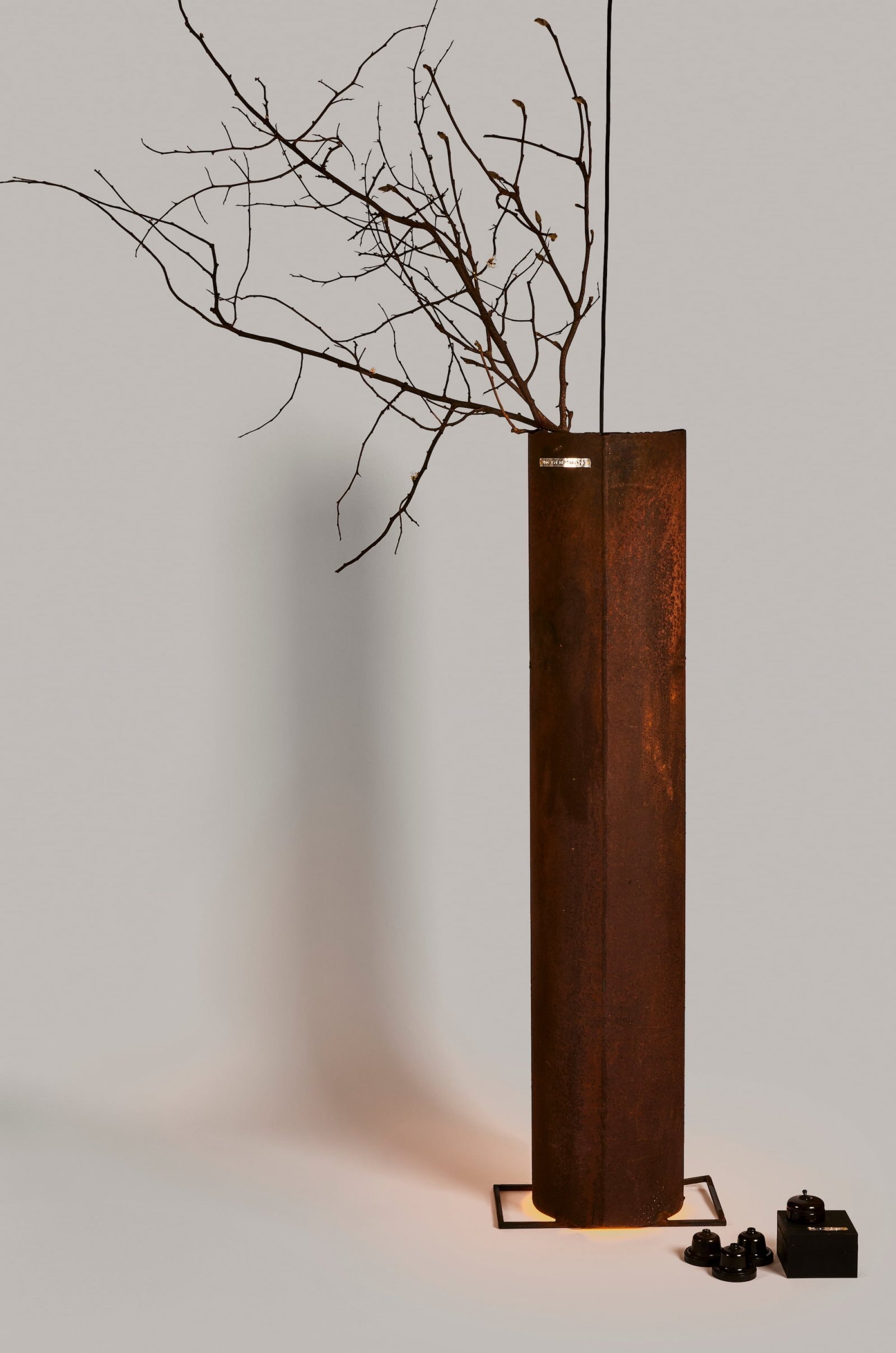 ロエベ財団 クラフトプライズ2019年のファイナリストである陶芸家・平井明子。彼女は、かつて工房で使っていた焼成窯のスチール製煙突を用いた。作陶のなかで時の経過を大切にしてきた平井は、長年にわたる窯の焼成によって錆を被った煙突を用いることで、時の経過を表現した。筒型煙突の内部に仕込まれた光源からは、満月を想起させる灯りが室内の天井に浮かび上がり、煙突のベースを床からわずかに持ち上げることで生まれる隙間からは、三日月が姿をのぞかせるようなデザイン。