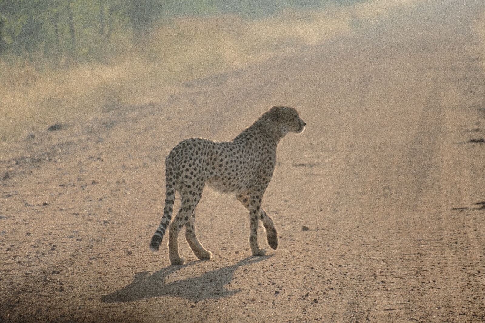 訪れたのは、早朝。まだ車も少なく朝のすがすがしい空気の公園で、私たちの車の前に1頭のチーターが現れました。優雅に歩くチーターの速度に合わせてしばらく車を並走。土埃の中、孤高のチーターが歩く大自然の光景に胸を打たれました。