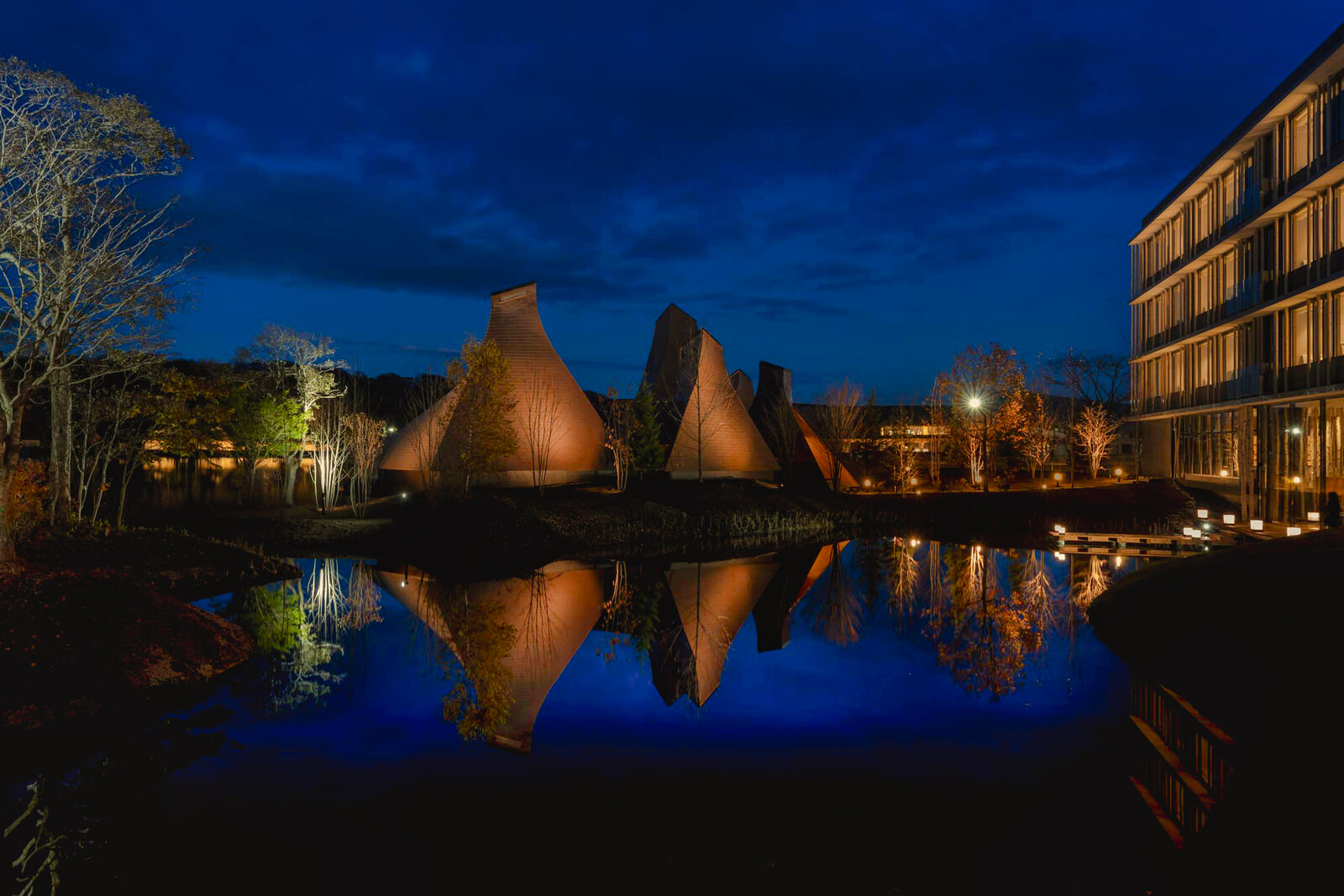 さて界 ポロトの特徴は、前述のロケーションやモール温泉の他に、旅館の建築設計にもありました。アイヌ文化を尊重し、宿泊者が多民族共生を体験できるよう建築家の中村拓志(ひろし)氏に依頼。敷地内にポロト湖を引き込み、施設のどこにいてもポロト湖を感じられるようしました。さらにポロトコタン(アイヌ民族集落)から着想を得て、アイヌ文化の建築の特徴である丸太組の三脚構造「ケトゥンニ」を基本とした湯小屋も建てられました。界 ポロト開業にあたり、事前の2018年6月、白老町とのパートナーシップ協定も締結されたといいます。