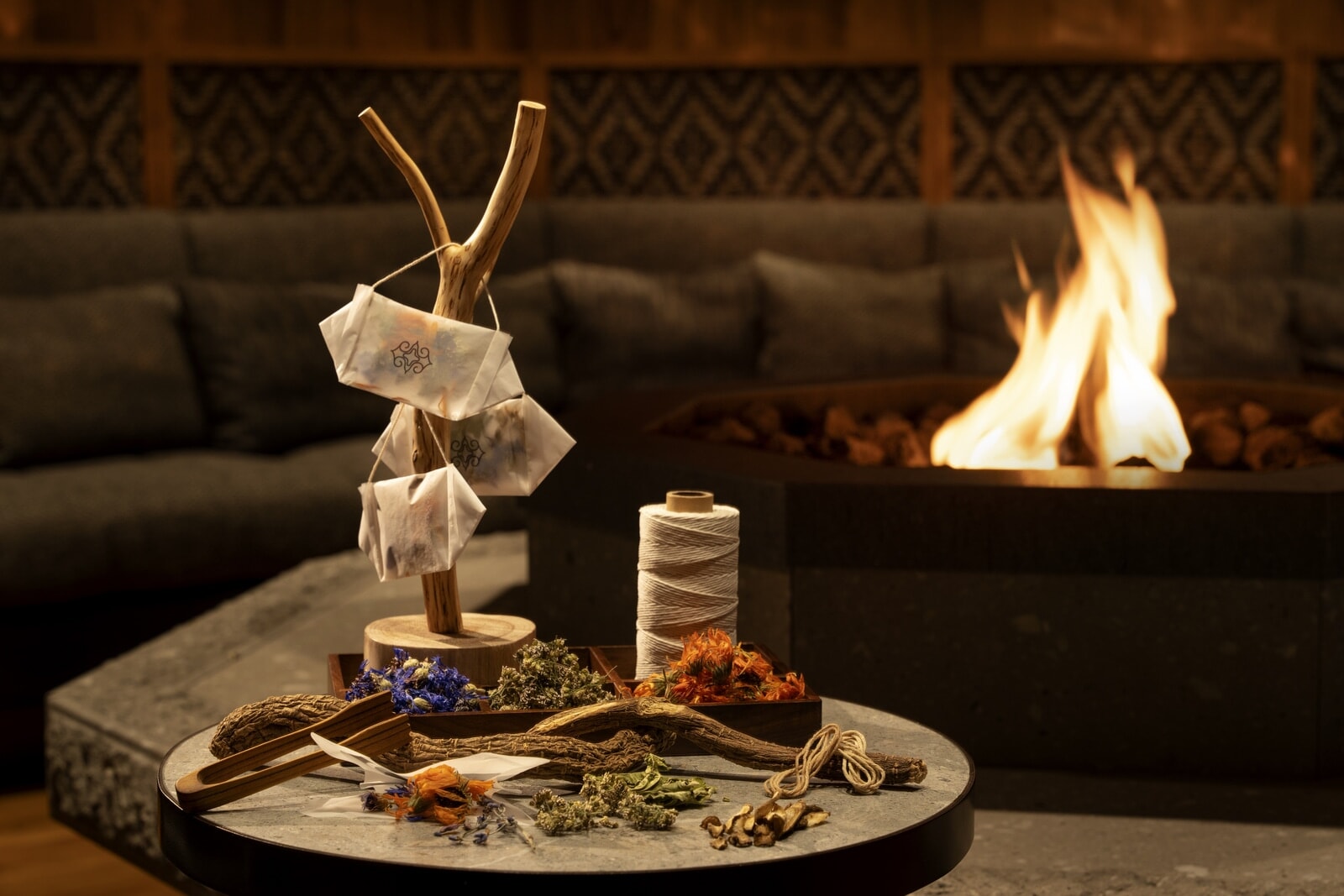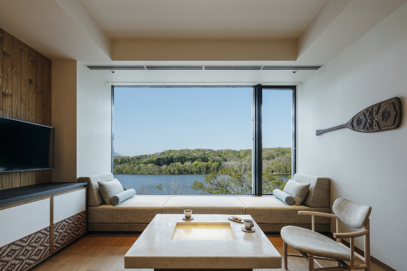 こうして特別なロケーションに佇む温泉旅館ではありますが、客室に座りポロト湖眺めながら、本当に何も聞こえないピュアな静寂に酔いしれました。たまたま小鳥の鳴き声も止まり、無風状態で、車も通らない夕暮れ時、この静寂に感動し満足感に浸った時間でした。居心地のいい客室はすべてアイヌ民族の暮らすチセ(アイヌ民族の家)から着想を得たといいます。全室にしつらえてあるのが、チセでも必ずあったという四角い炉をイメージしたテーブルで、その炉には火を焚いているかのようにオレンジの光が灯され、炉を囲んで団らんをと願っています。他にも室内の壁には木彫りのオールが飾られ、壁紙やクッションなどにアイヌ文様が施されています。