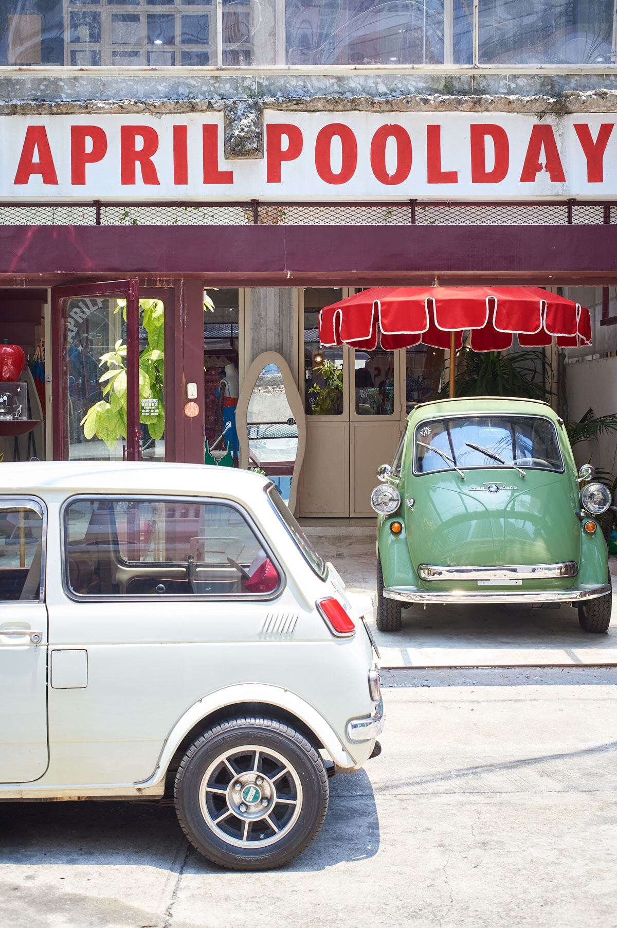 店にはプールやヴィンテージカーがあり、気軽に楽しめるバースペースも。