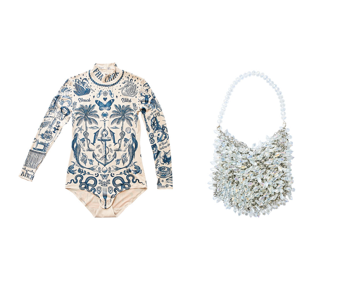 左 自身のドローイングをプリントしたセカンドスキンのボディスーツ4,200バーツ 右 クリスタルを手作業で繋ぎ合わせたバッグ4,790バーツ