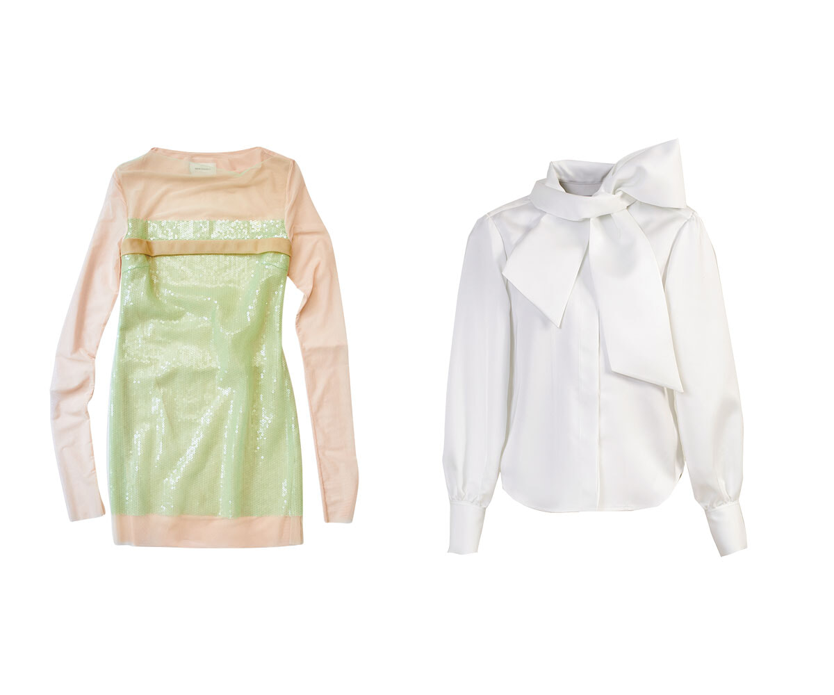 左 ヌーディなチュールとスパンコールのドレス6,650バーツ 右 ボリューミーなボウブラウス7,350 バーツ