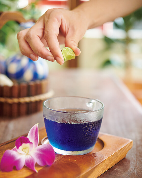 ウェルカムドリンクはバタフライピーティー。ライムを搾ると紫に変わる。