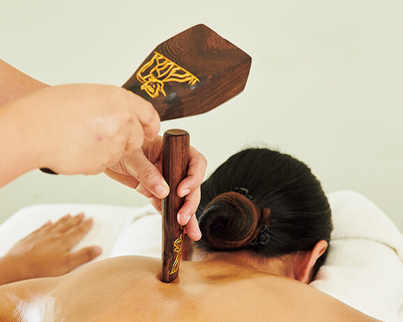 木槌をリズミカルに叩いて血行を促進し筋肉の緊張をほぐす、北タイに伝わる伝統医療「Tok Sen」もおすすめ。