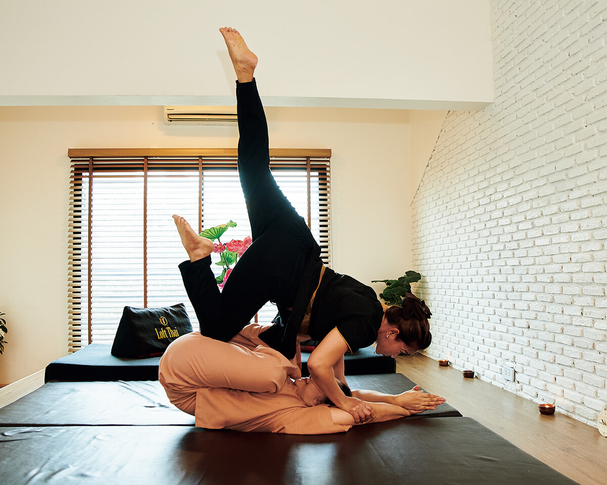 われたという13世紀から伝わる伝統療法「Thai Warriors Massage」。タイ式ヨガのルーシーダットンに、ムエタイの動きを取り入れたリズミカルな動き、肘や膝を使って与える強い圧、深いストレッチによって凝りがほぐれて滞っていた血流が促される。