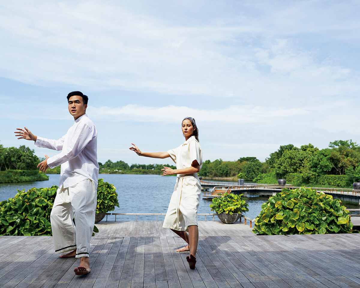 敷地内の湖の前で行う太極拳。ゆったりした動きと呼吸法で心と身体の繋がりを高める。©︎RAKxa Wellness