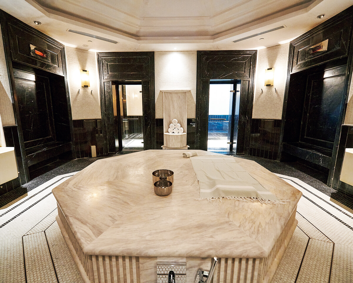 “ウェルネス”がテーマの5ツ星ホテル、シンドーン・ケンピンスキー内の施設は、世界から豪華な設備を集め、多彩なメニューを揃えている。ここで体験すべきはモロッコの伝統蒸気浴ハマム。大理石の上に寝そべり黒塩のスクラブで肌を磨かれるひとときは、えも言われぬ至福の時間。シャワーの水圧で身体の凝りをほぐすフランスの水圧療法ヴィシーシャワー、エプソムソルトの力で浮遊体験を味わうフロートセラピーなどハイドロセラピーメニューも見逃せない。さらに7つのサウナも完備。一日ゆっくり過ごして英気を養おう。