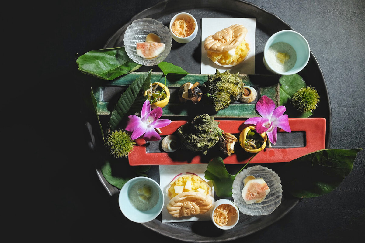 CYAN─詩庵─では、松葉ガニや但馬牛、八鹿豚といった食材が、美しいうつわで提供される。