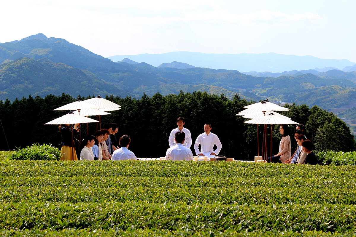 高台にある茶畑に設けられたスペースで、茶農家もしくはコンシェルジュがお茶を淹れてくれる。嬉野温泉街を見下ろしながらいただく一服は格別の味わい。
