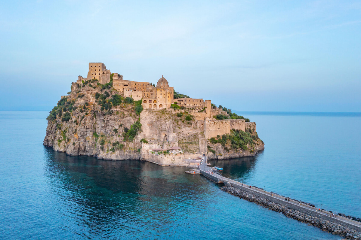 紀元前4世紀に古代ローマ人が街を建設したというイスキア島は、古代ローマ時代から続く癒やしの湯や14世紀に建てられたソッコルソ教会など歴史的な見どころが点在する。島の東端にあるアラゴン城は、もともとローマ人が要塞にしていた島に15世紀に建てられたもので、歴史の名残があちこちに。城へと続く散歩道は、夕暮れを狙って出かけよう。