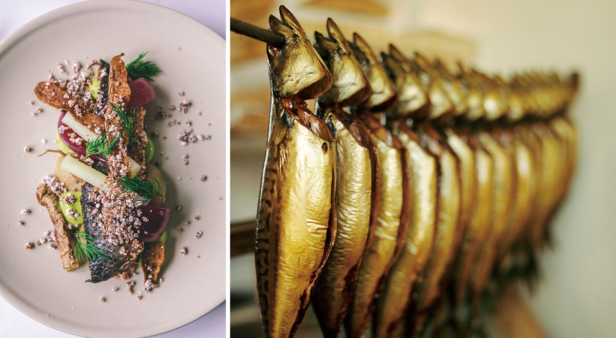 新北欧料理からヒントを得た、旬の野菜やハーブなどをトッピングしたおしゃれなひと皿から、港の燻製所で食べる伝統的な燻製ニシンのオープンサンドまで幅広く楽しめる。photography: Destination Bornholm