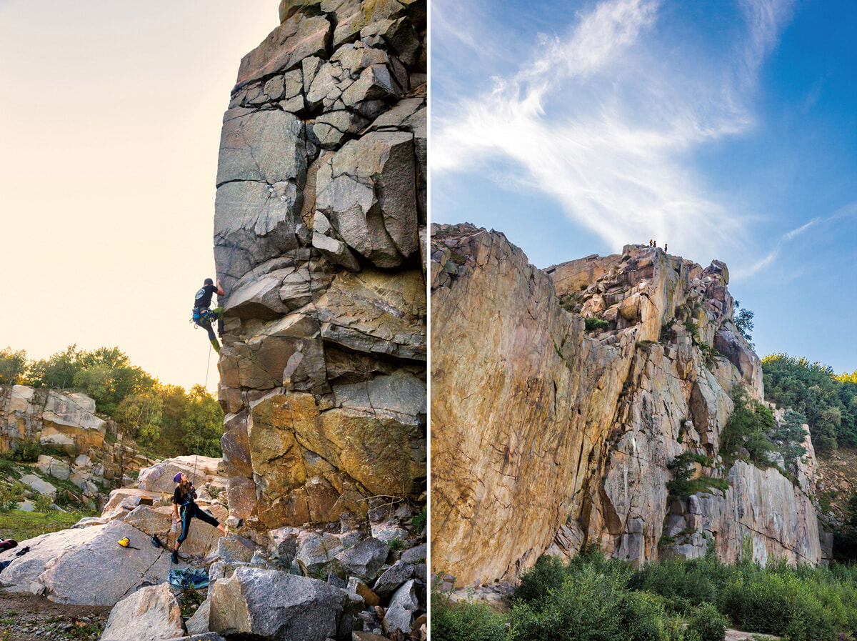 左:コペンハーゲン市庁舎や国立博物館の建物に使われた、ボーンホルムの花崗岩は、「ヴァン花崗岩採石場”Vang Granite Quarry”」から運ばれた。1996年に閉鎖されたが、跡地はピクニックやクライミング、マウンテンバイクのコースとして完備されている。島の手付かずの自然を体験したいアウトドア派におすすめ。右:岩肌の崖が多いボーンホルムの海岸沿いは、クライミングに最適。出発前に専用アプリ、”Climbing on Bornholm”で、コースの状況をみたり、自分のレベルにあったコースを選ぶ。photography: Semko Balcerski