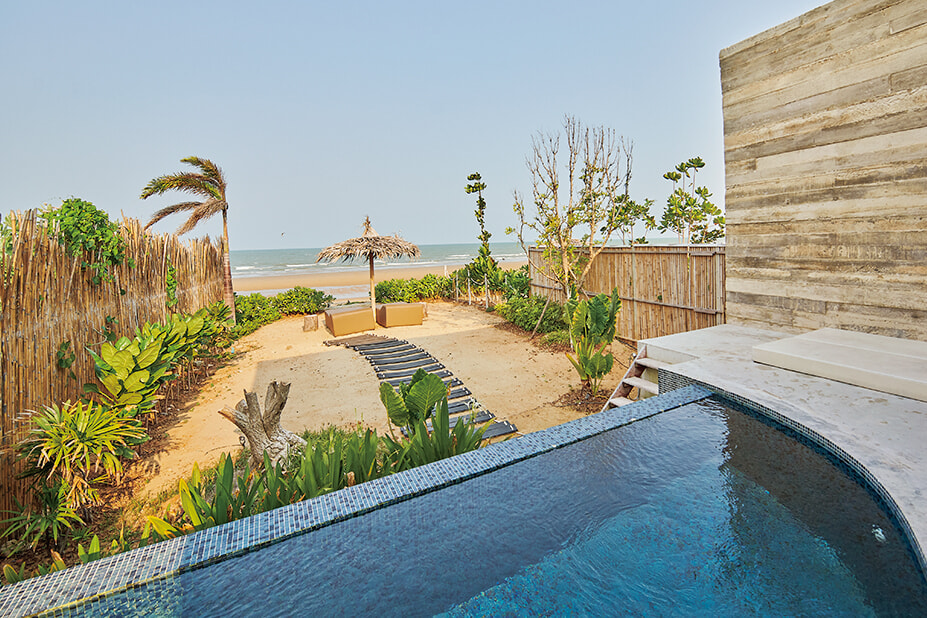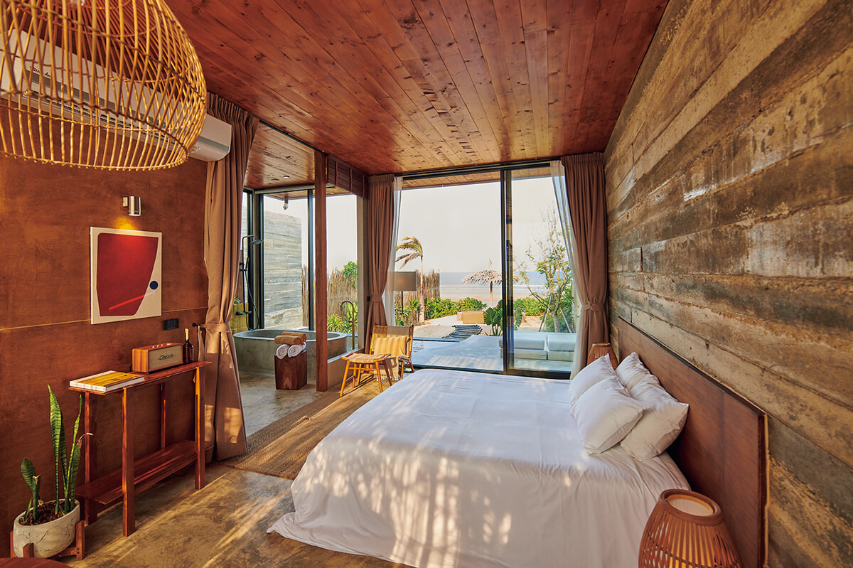 さらに内陸部へ足を延ばすと、象が共存するワイナリーがある。象にバナナをあげ、畑を見渡すテラスでブドウのパッタイとロゼワインのランチをいただいてから宿へ。昨年誕生したわずか4室のデミ・スリーは、自然と一体化したような素朴さがある。夜は外のビーチチェアで星を見ながらうとうと、朝は波の音で自然に目覚める暮らし。プランブリには、常に自然がそばにある、心地いい時間が流れている。