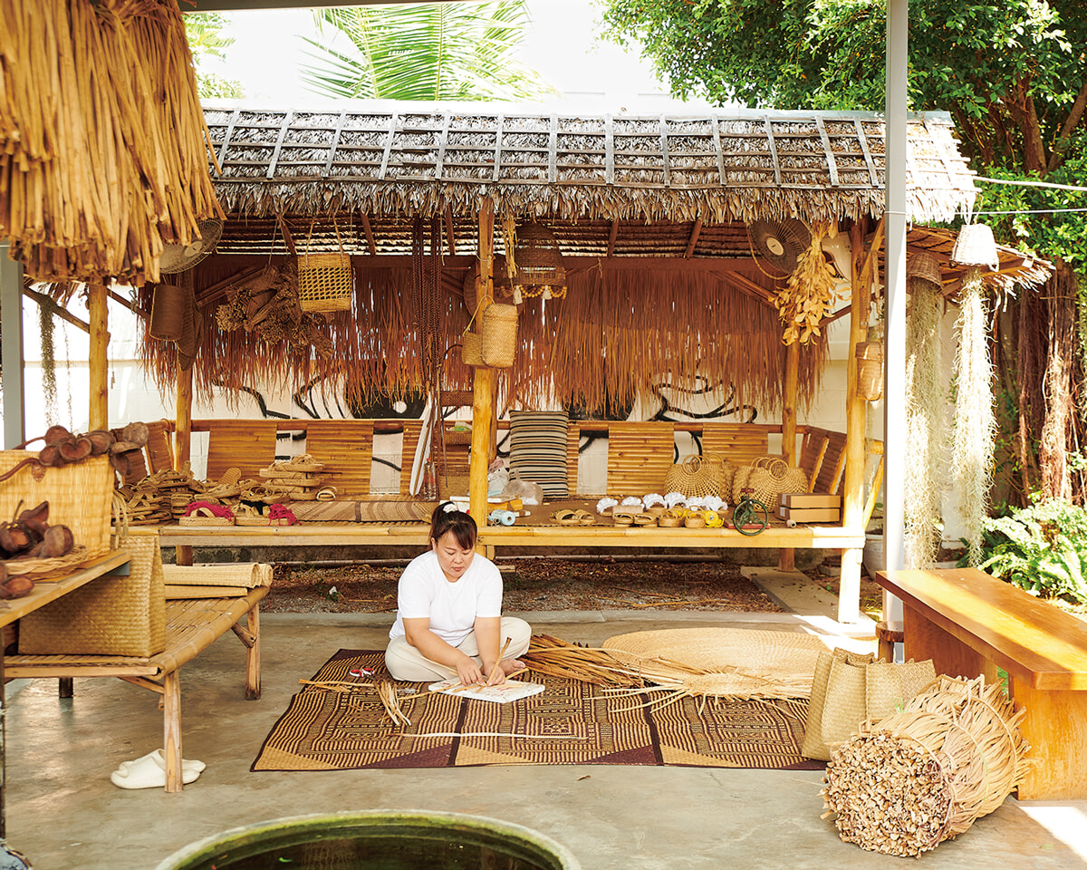 水草の一種、ウォーターヒヤシンスはタイ全土で定着する自然素材。そのほかヤシや竹を使ったバッグやゴザ、サンダルを販売している。デザインはすべて、外国人オーナーがこの地にインスパイアされて生まれたもの。店内でのショッピングも楽しいが、おすすめはワークショップへの参加で、地元の職人にいちから編み方を教えてもらえる。コツをつかむのが難しいが、手を動かすうちに没頭するはず。