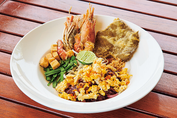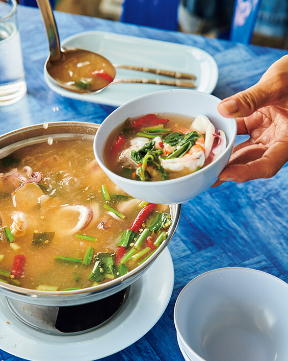 周辺の海で獲れた新鮮な魚介類が現地価格で楽しめる、島いちばんの人気食堂。料理自慢の女性たちが豪快にフライパンを振り、エビやイカを料理している姿が目に留まる。素材を生かした味付けはシンプルだが、旨味がたっぷりで新鮮な魚介が味わえる。イカ墨を使ってイカを煮た「プラームックトムナムダム」など、バンコクではあまり出合えない島料理も。