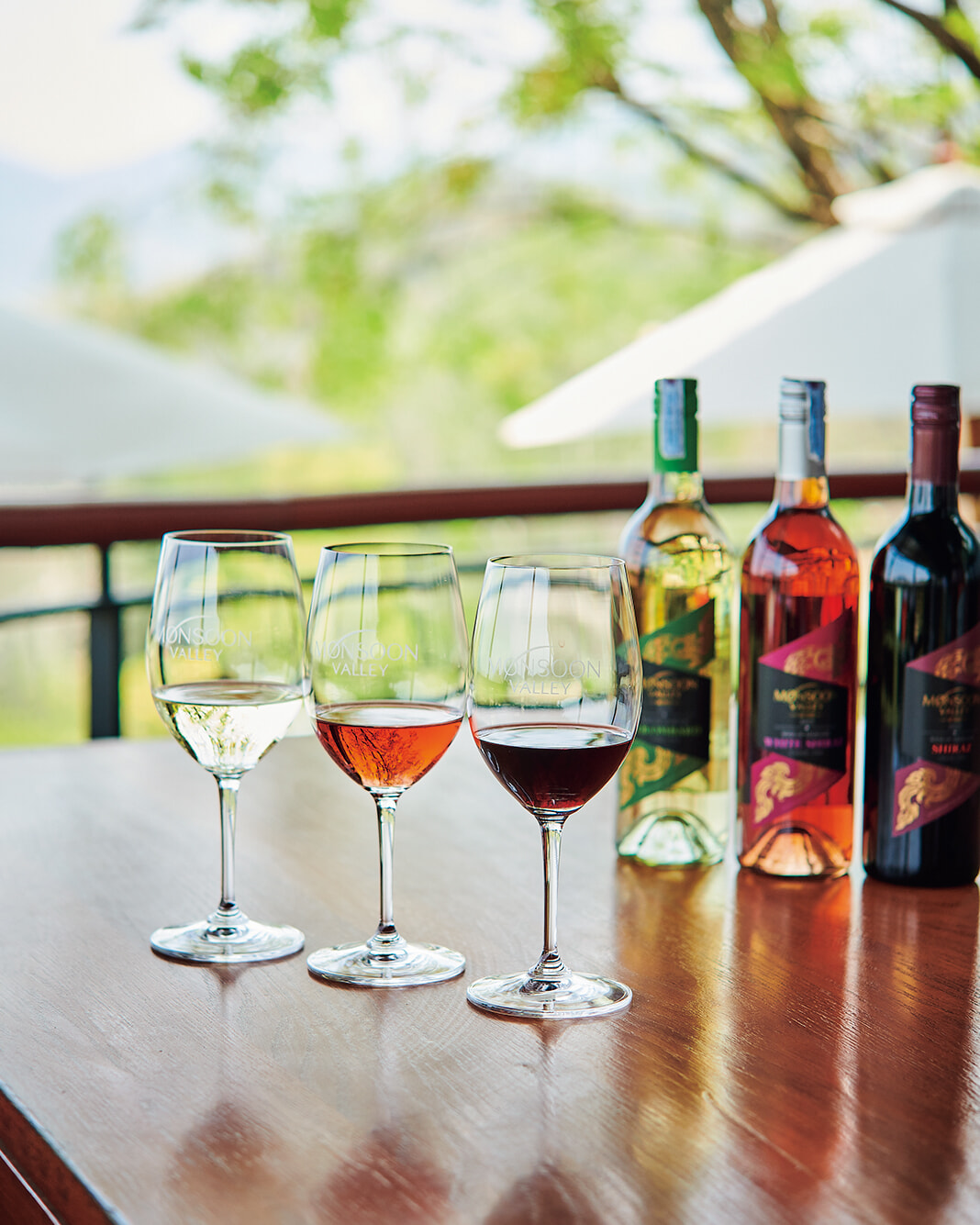 左から、「Colombard」、シラーズのロゼ「White Shiraz」、赤ワイン「Shiraz」 グラス各190バーツ