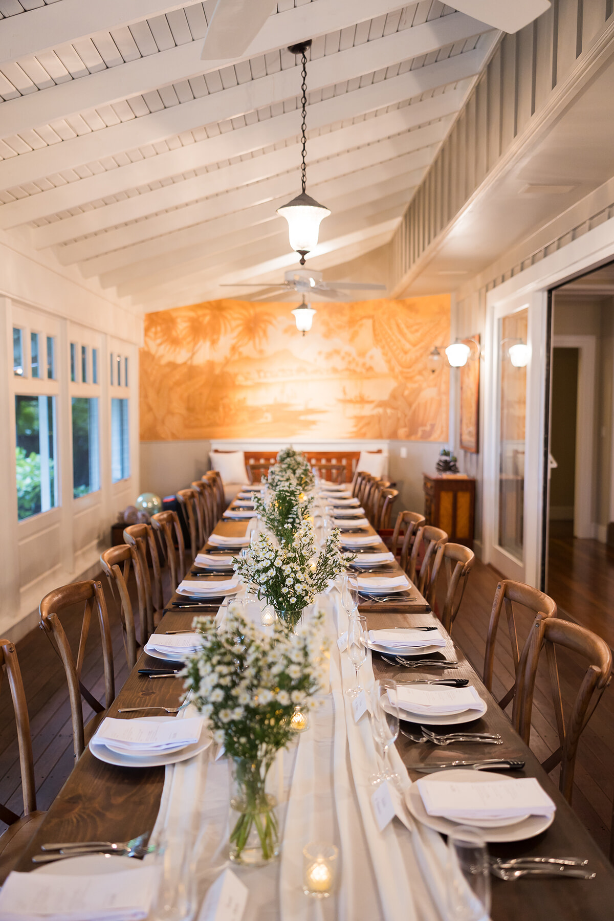 サンセットを狙って、16時〜21時の時間設定でした。終わりの時間を気にせず、本当にゆったりとアットホームにできました。当日の流れは、最初に私たち夫婦の準備が整ったとき、「ファーストミート」ということで、両親たちにお披露目をしました。もうその時点で二人とも泣いちゃっているんです(笑)。その後ガーデンで挙式を。披露宴は、全員が着席できる長いテーブルで食事をいただき、二人で協力して製作したビデオを流しました。その後に、それぞれの両親の「バウリニューアル」のセレモニーをし、最後には、ベタですがどうしてもやりたかった手紙とウエイトドールを両親に手渡しました。