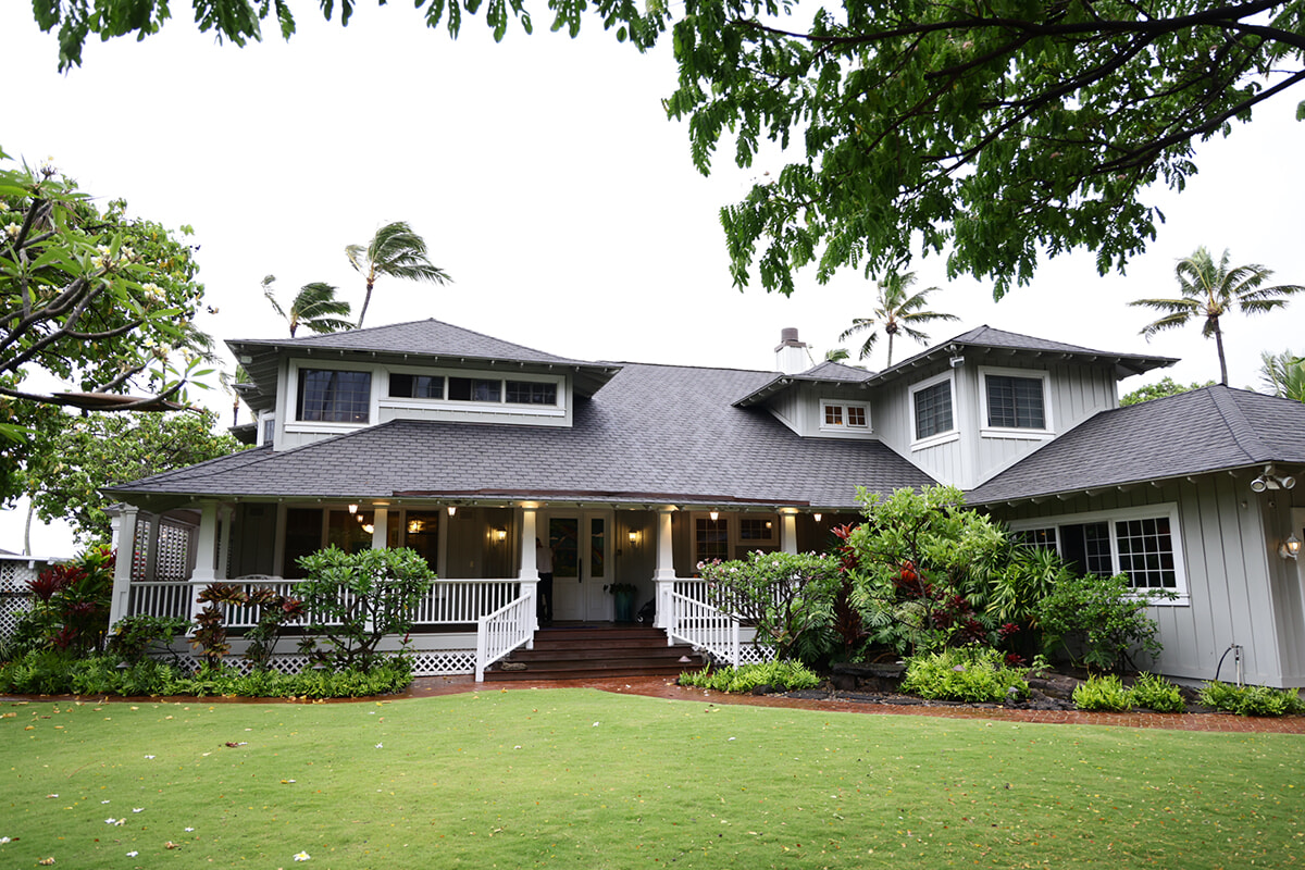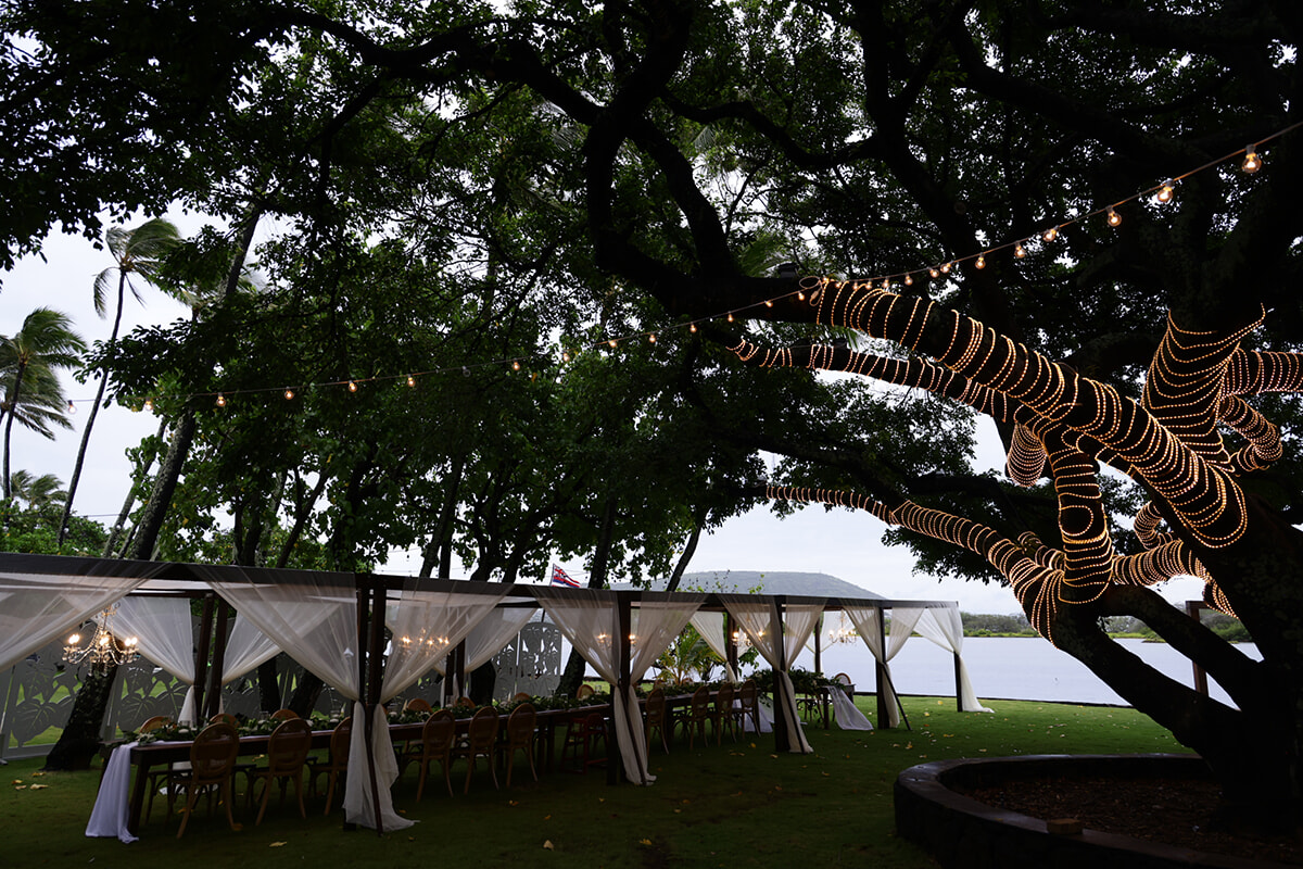 夫:オアフ島のカハラ地区の住宅地にあり、静かな入江に面した邸宅でした。理想のウエディングパーティの写真をたくさん集めて、イメージボードを作りました。挙式のためのアーチ、ゲストが座る椅子、ケータリングやウエディングケーキ、シャンデリアもすべてイメージを固めてリクエストしました。