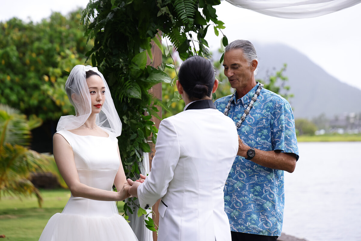 花:まずは家族のために、というのが大きかったと思います。持病を持っていた私の父が、コロナ禍で大きな手術を2度経験しました。父に結婚式を目標にリハビリを頑張ってもらいたかったのと、ハワイは家族旅行でよく行っていたので、母が「コロナが明けたらまたみんなで行きたいね」とよく話していました。そういう出来事もあって、家族との時間を大切にしたいという思いが強かったのだと思います。結婚から5年経つタイミングならば、ゲストを大勢呼んでホテルで挙式をするよりも、家族旅行の延長のような感じでアットホームな式ができたらいいなという思いでハワイを選びました。親戚には高齢の方も子どもたちもいたので、気候的にも一番良かったというのもあります。