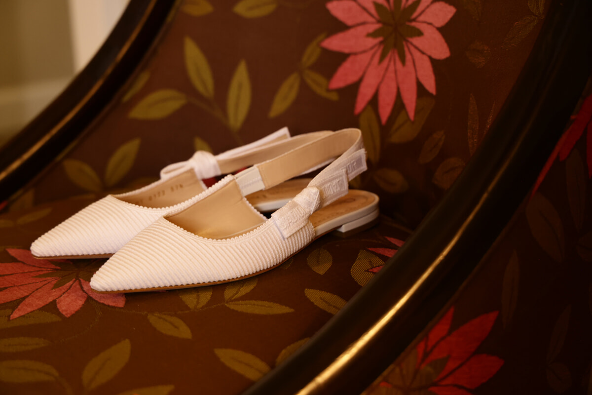 軽やかなドレスのイメージに合わせて、ブーケも可憐な雰囲気にしたかったので、ハワイで手に入る”アスター”という花を束ねてもらいました。このアスターという花を、オーダーで作ってもらった3段のウエディングケーキにもデコレーションしてもらったんです。シューズは私の好きなものを履きたいと思い、ディオールのウエディングシューズで白いフラットを見つけました。日本には無いモデルでしたが、パリの倉庫から急遽送っていただくことができました。アクセサリーは、ハリー・ウィンストンの一粒ダイヤのピアスとペンダントで揃えています。結婚後、誕生日や記念日に夫から貰ったものです。顔まわりにリボンやヴェールがあるので、大きなジュエリーはつけたくなく、思い出もあるシンプルなジュエリーにしました。