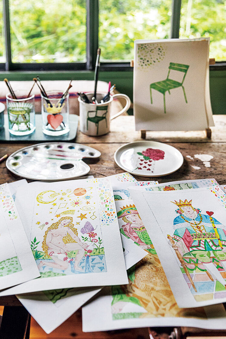 「芸術家だった祖母は、よくタロット占いをしてくれました。絵を満載した車でやってきて荷物を下ろすと、まず占うのがいつものパターン。母も占いができました。やがて家族以外の人にも占ってもらうようになり、タロットカードを作りたいと思うようになりました。占い自体はさておき、タロットの世界は日常から離れられるのがいいのです。作りたかったのは、たとえ遊び方を知らなくてもただ美しいというだけで買う気を起こさせるカード。ここで2年かけて完成させました。少しでも時間があるとカードを描いていましたね。どのイラストも自分で描き、それをスタッフがスキャンしてさまざまな製品に展開しています」