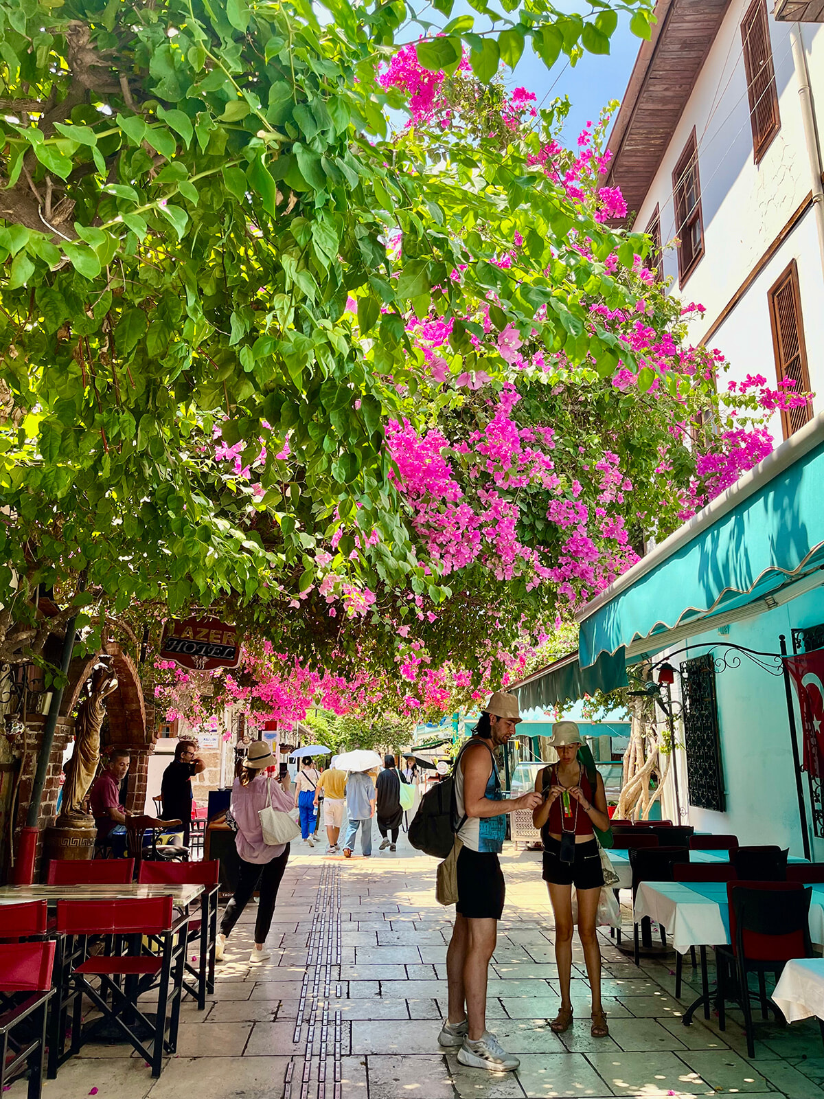 カレイチと呼ばれるアンタルヤ旧市街を訪れたのも、まだ日差しの強い昼下がりだった。カレイチとはトルコ語で「城壁の中」。堅牢な城壁の内側に美しい保存状態の街が広がっている。古代ローマ時代の馬車の轍が残る門をくぐって旧市街に入ると、石畳の細い路地が張り巡らされていて、雰囲気のいいカフェやレストラン、ブティックホテルが点在する。建物の多くはオスマン帝国時代のものだそうだ。乾燥した石畳の路地に立つ白い建物と、街中に咲き乱れる満開のブーゲンビリアや露天に並ぶオレンジやスイカなどのフルーツの鮮やかな色とのコントラストに目を奪われる。