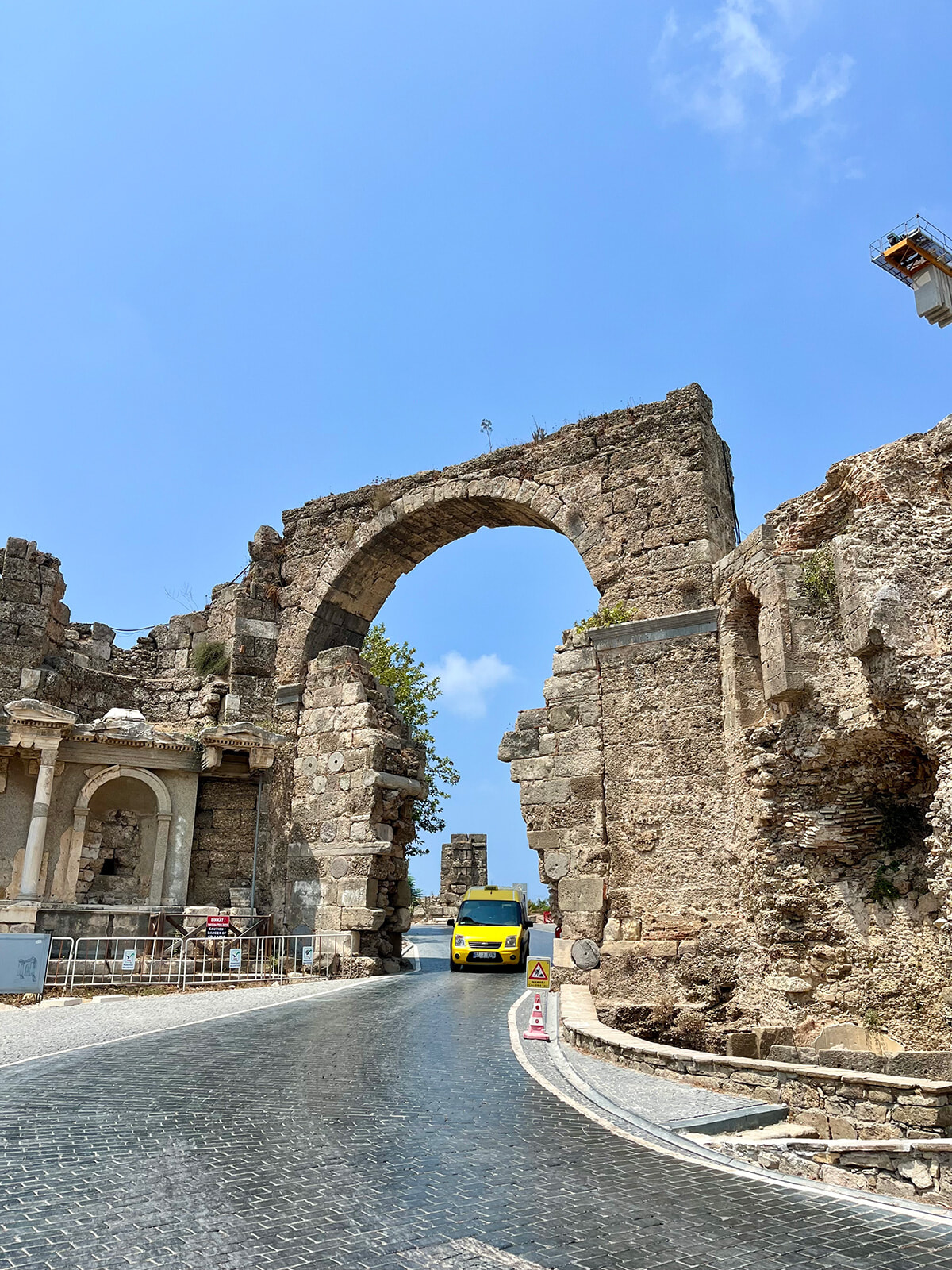 カレイチを離れ東へ約75km、半島に位置するもう一つの海辺の街・シデを訪れた。古いアナトリア地方の言葉で「ザクロ」という意味を持つこの港町は、女神アテネに捧げて紀元前7世紀につくられたそうだ。古代ローマの遺跡が残る街とは聞いていたが、素晴らしい保存状態の円形劇場などの遺跡の規模に圧倒されてしまう。