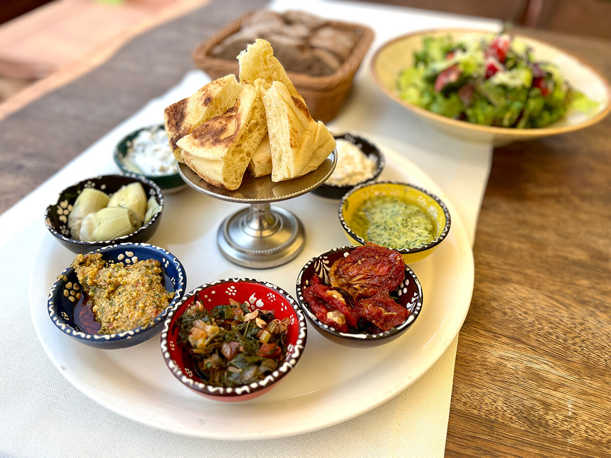 トルコ料理を構成する要素として欠かすことができないのがメゼ(前菜)だろう。フムスや、野菜をオリーブオイルで炒めたシャクシュカなど。各店自慢の前菜が小皿や、大皿に少量ずつ盛られる。