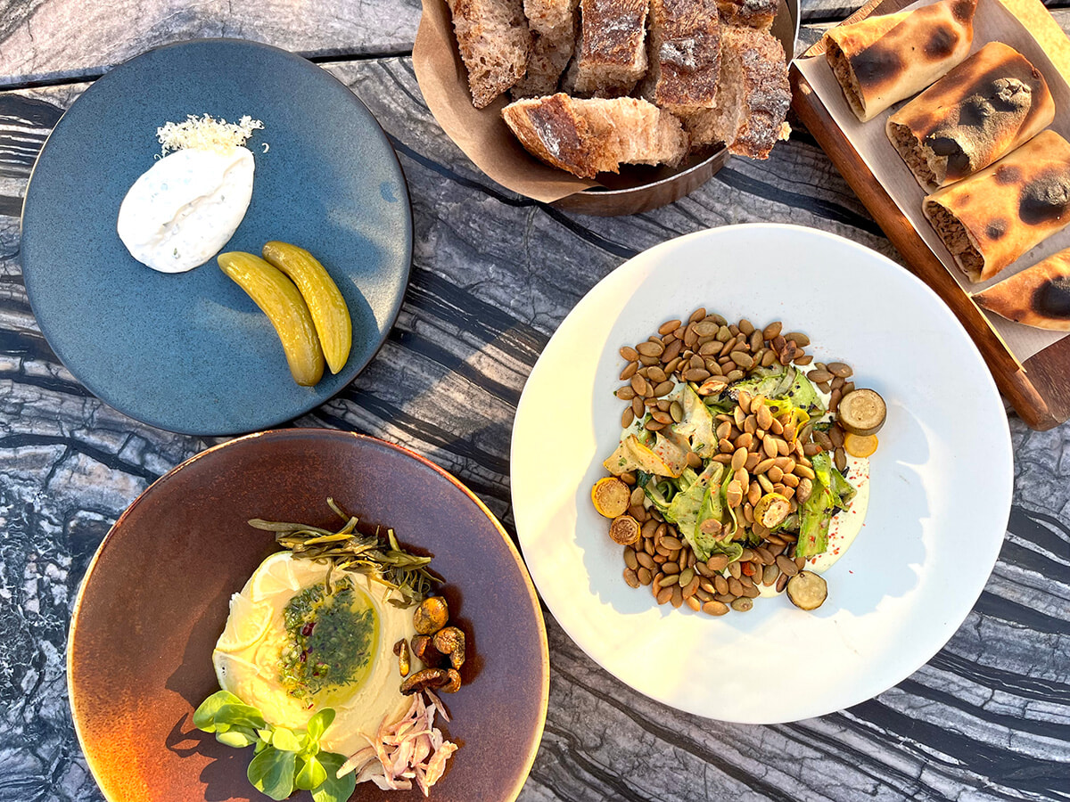 ホテルが経営するレストラン「サルニック」のランチコースの前菜。ひよこ豆のフムス、モハマラ(トマトとパプリカのペースト)、ハイダレ(ヨーグルトとミント)メゼ。