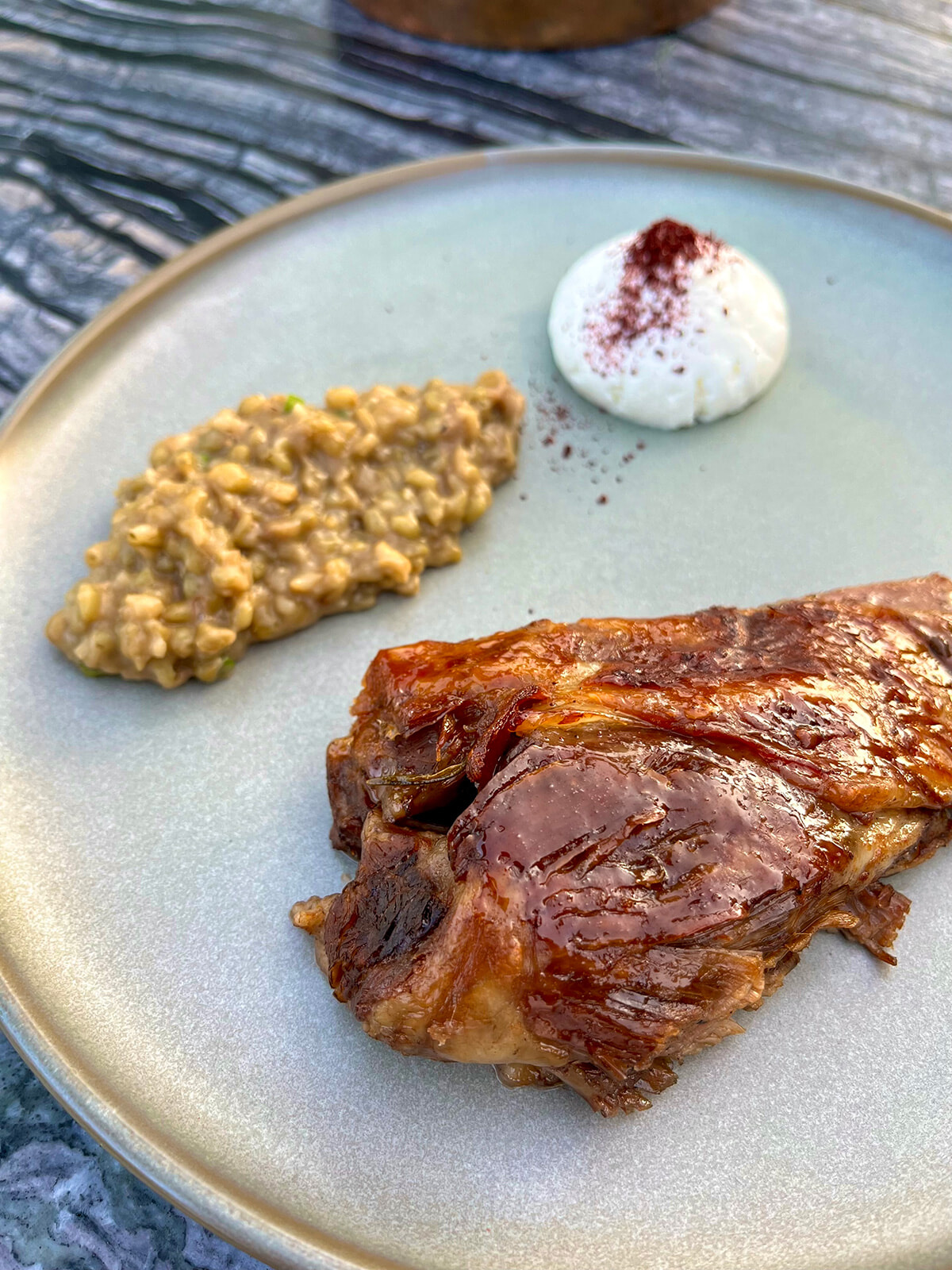 スローローストされたラムの肩肉。香辛料のマリネ液に24時間漬けてから95℃で9時間火を入れ、ハチミツと80種類のスパイスがミックスされたメッセルマージュを塗って焼く。香ばしさと柔らかさが混ざり合う複雑で豊かな味わい。