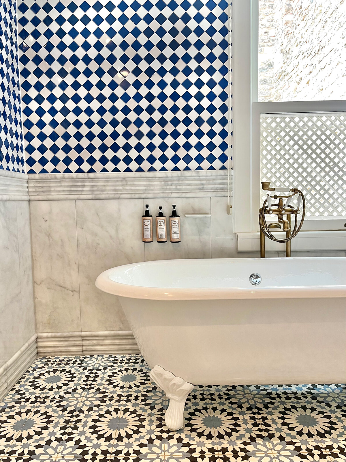 イスラミックな模様のタイル装飾が美しいバスルーム。