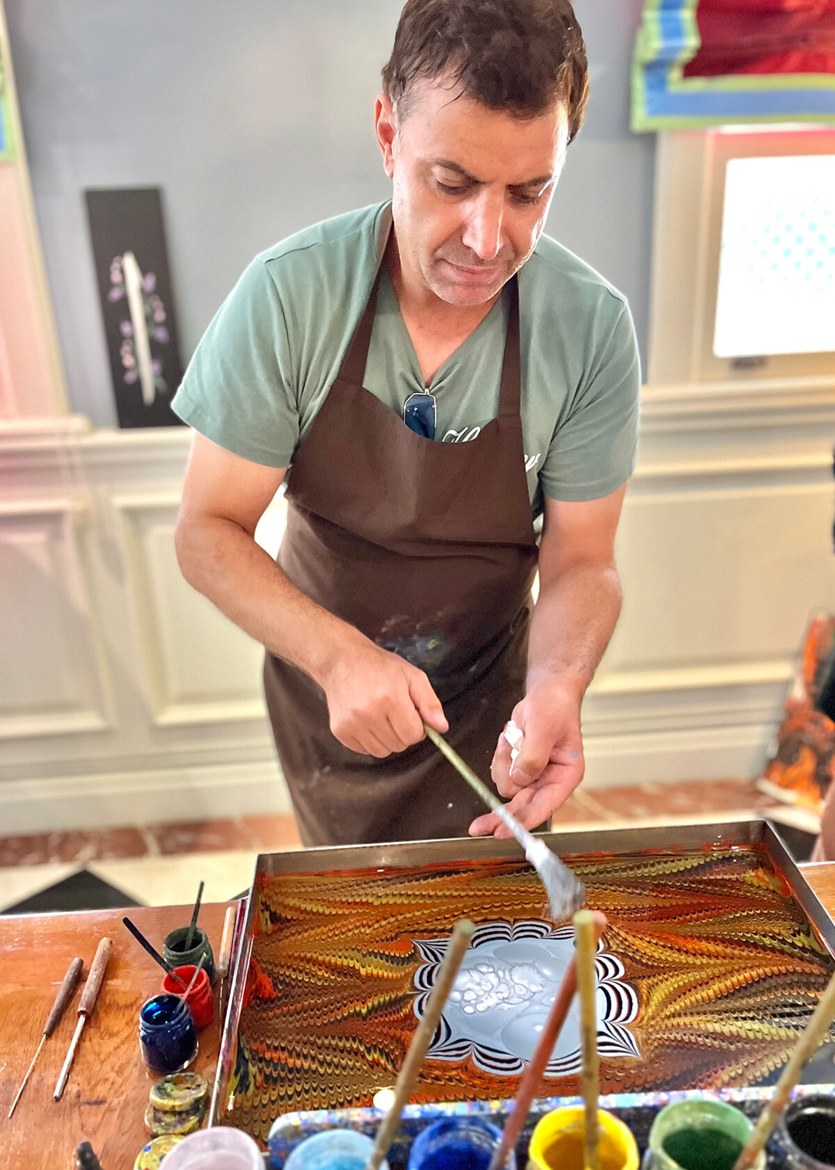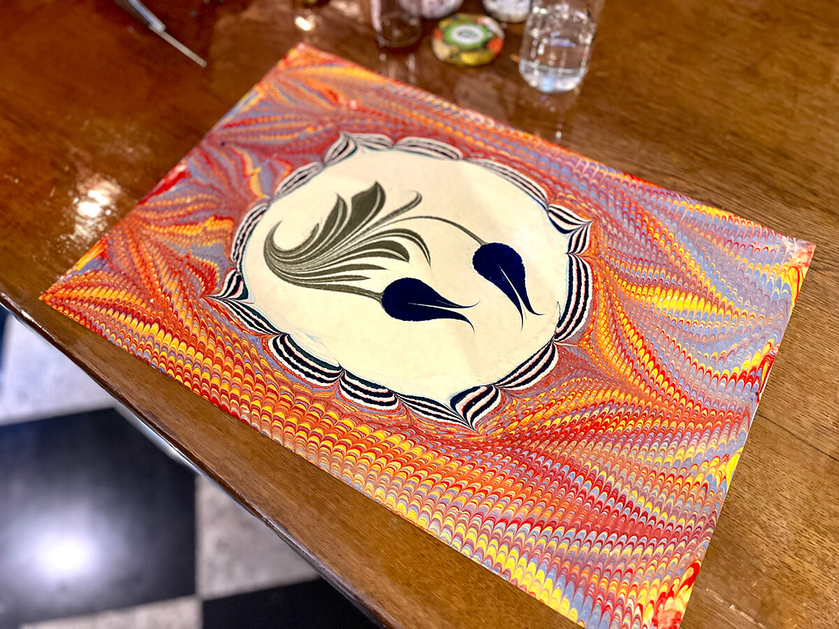 邸宅ホテルの一角で開催されていたトルコ伝統芸術「エブル(マーブリング)」のワークショップ。水の上に落としたインクで模様を描く。