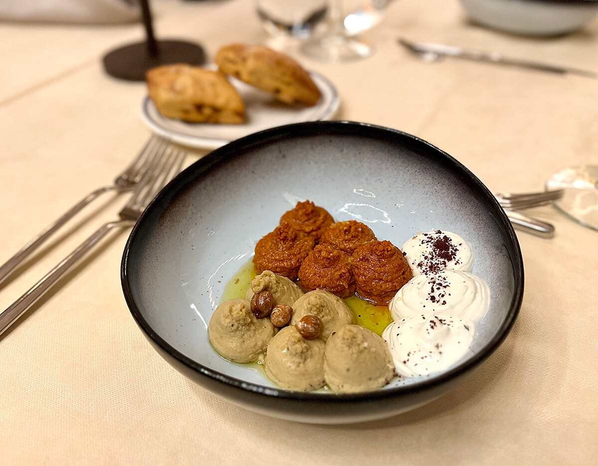 スモークしたヨーグルトやグリーンピースのペーストなど、すべてトルコの食材を用いてメニューが構成される。「新鮮なものを正しく扱うようにしています」とシェフ。