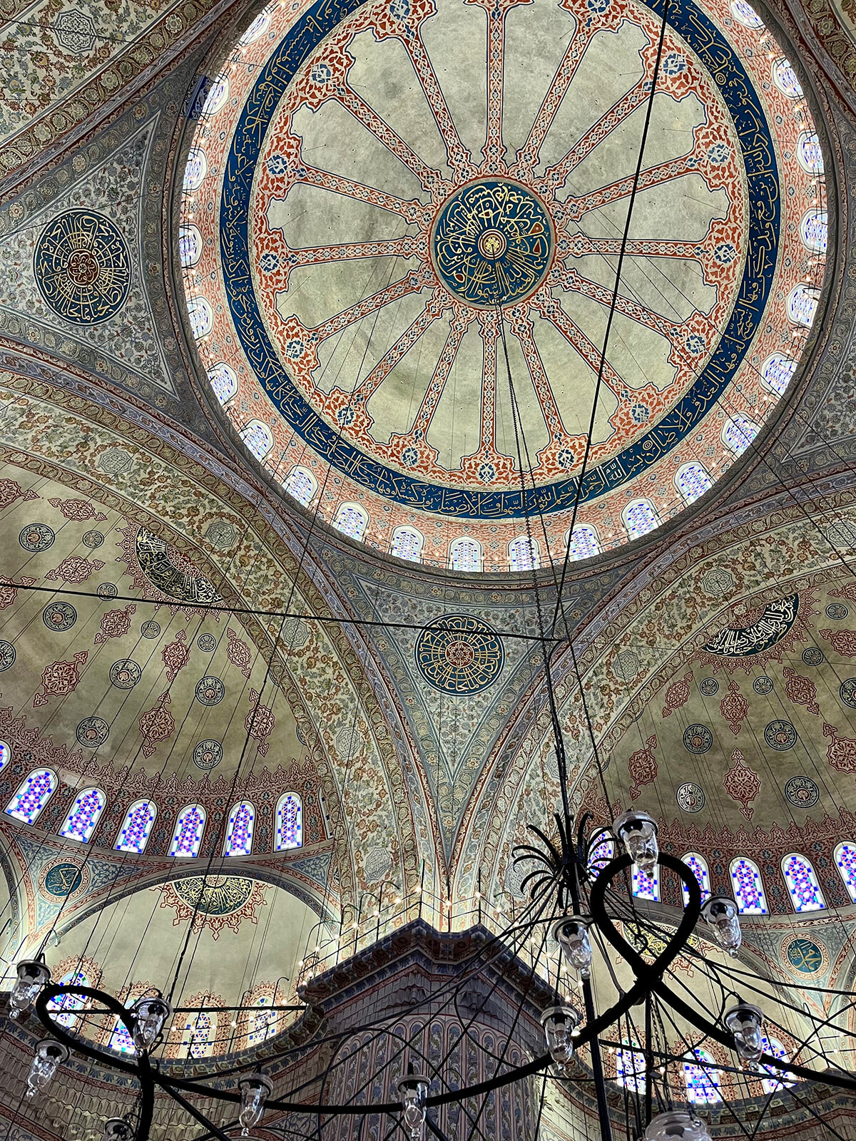 「ブルーモスク」の愛称を持つスルタンアフメット・ジャーミィ内部は2万枚以上の鮮やかな青色のイズニックタイルで装飾されている。