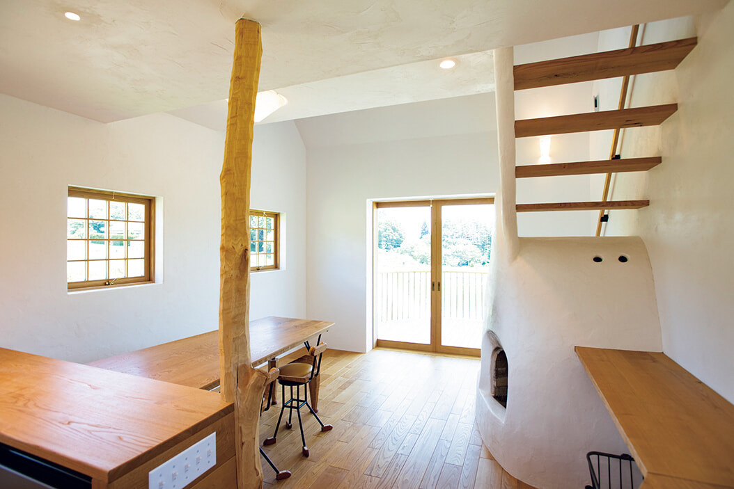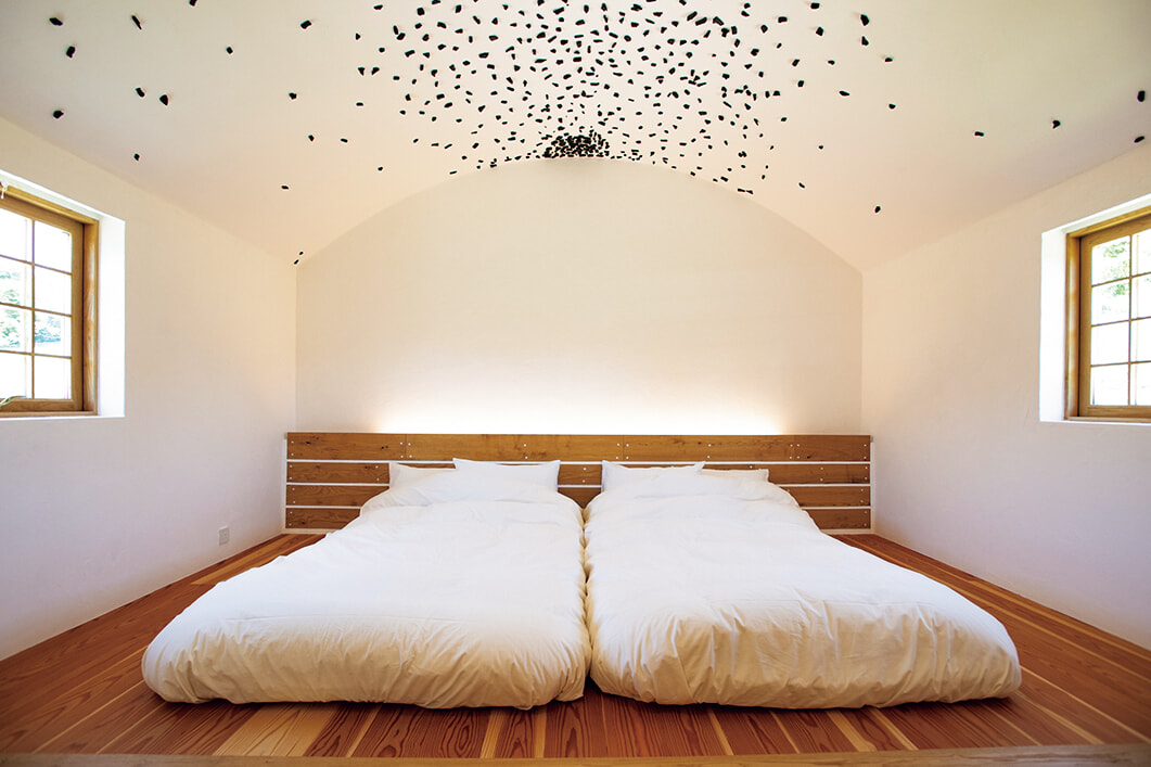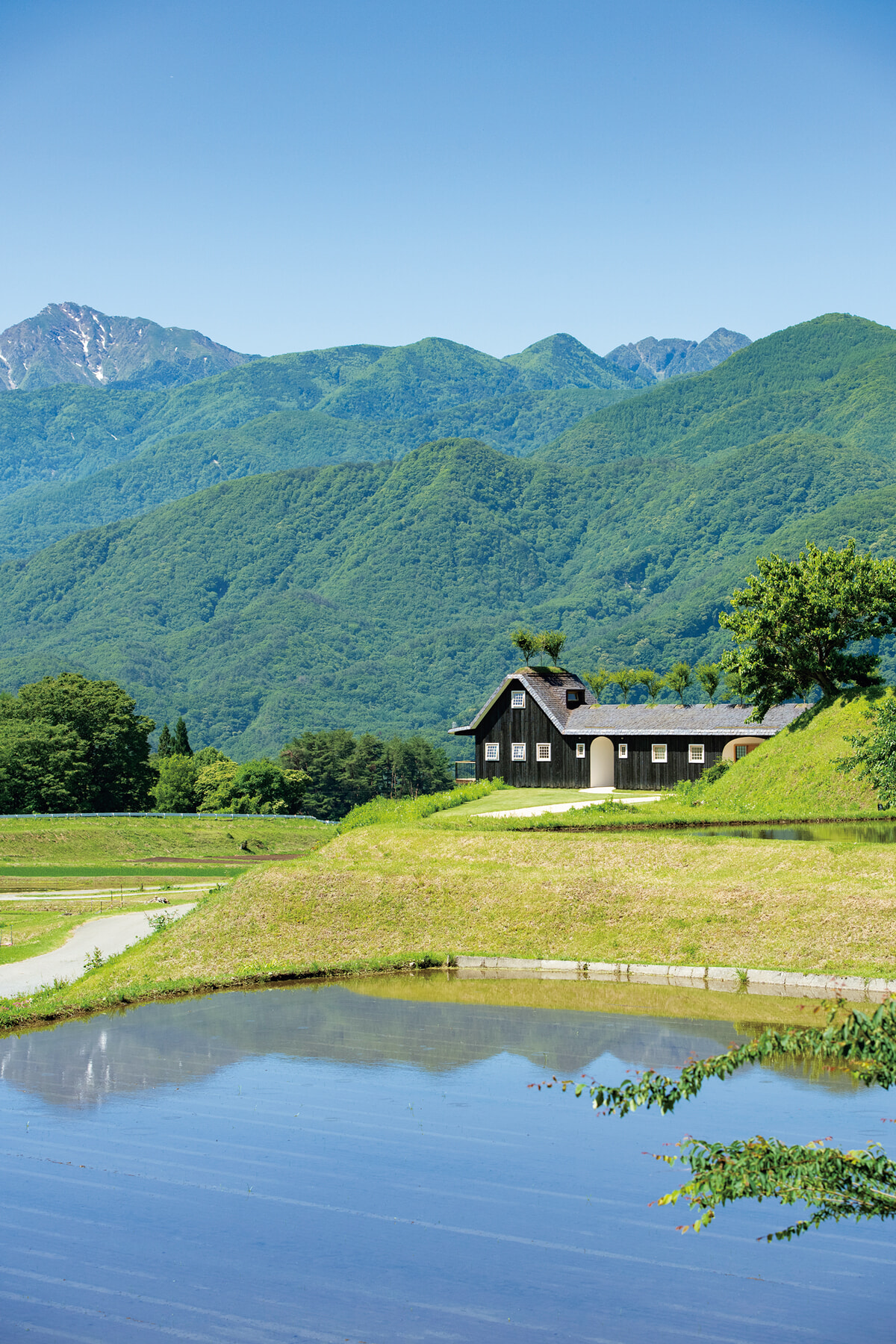山梨県との県境の、八ヶ岳山麓に位置する長野県富士見町。四方を緑の水田に囲まれた高台に、昨夏、1日1組限定こぢんまりとした宿泊施設がオープンした。焼杉の板で覆った外壁と、手曲げ加工の銅板をあしらった屋根が印象的な建物は、建築家の藤森照信が手がけたもの。”自然との調和”をテーマに掲げる藤森建築に惚れ込んだオーナーが、2010年に設計を依頼。13年という年月を費やして完成した施設は、南にそびえる富士山と、シンボルツリー、樹齢300年の枝垂れ桜を軸にした、細長いフォルムが印象的。室内の壁や天井は白漆喰で仕上げ、森から切り出した栗の木を柱や家具に活用している。この地の自然と完璧にマッチする施設は、長閑な里山の風景と相まって、まるで絵本の中から抜け出たような印象を与える。