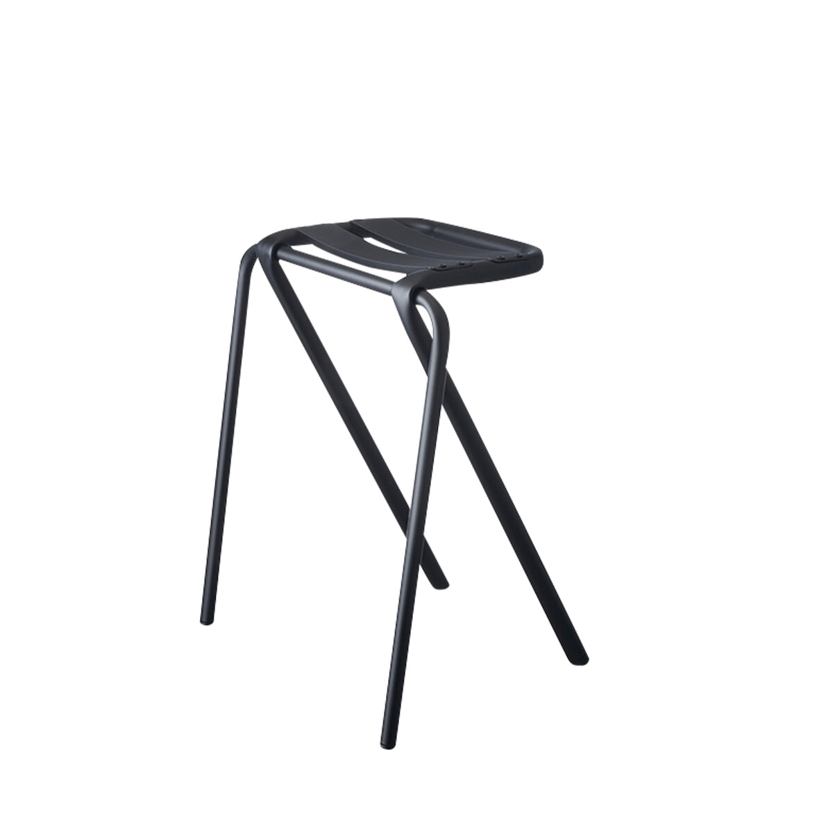 パイプの一部を潰すように押し曲げる伝統的な金属加工技術を、デザイナーの岩元航大がスツールへと転用。座面の端から伸びた2本のパイプをぐにゃりと曲げて、前脚に絡みつかせている。