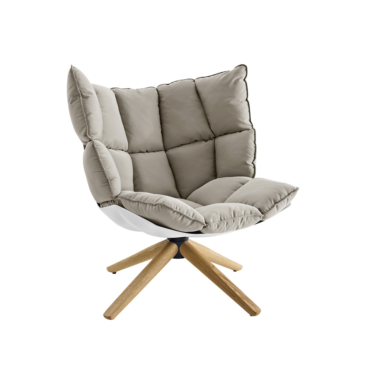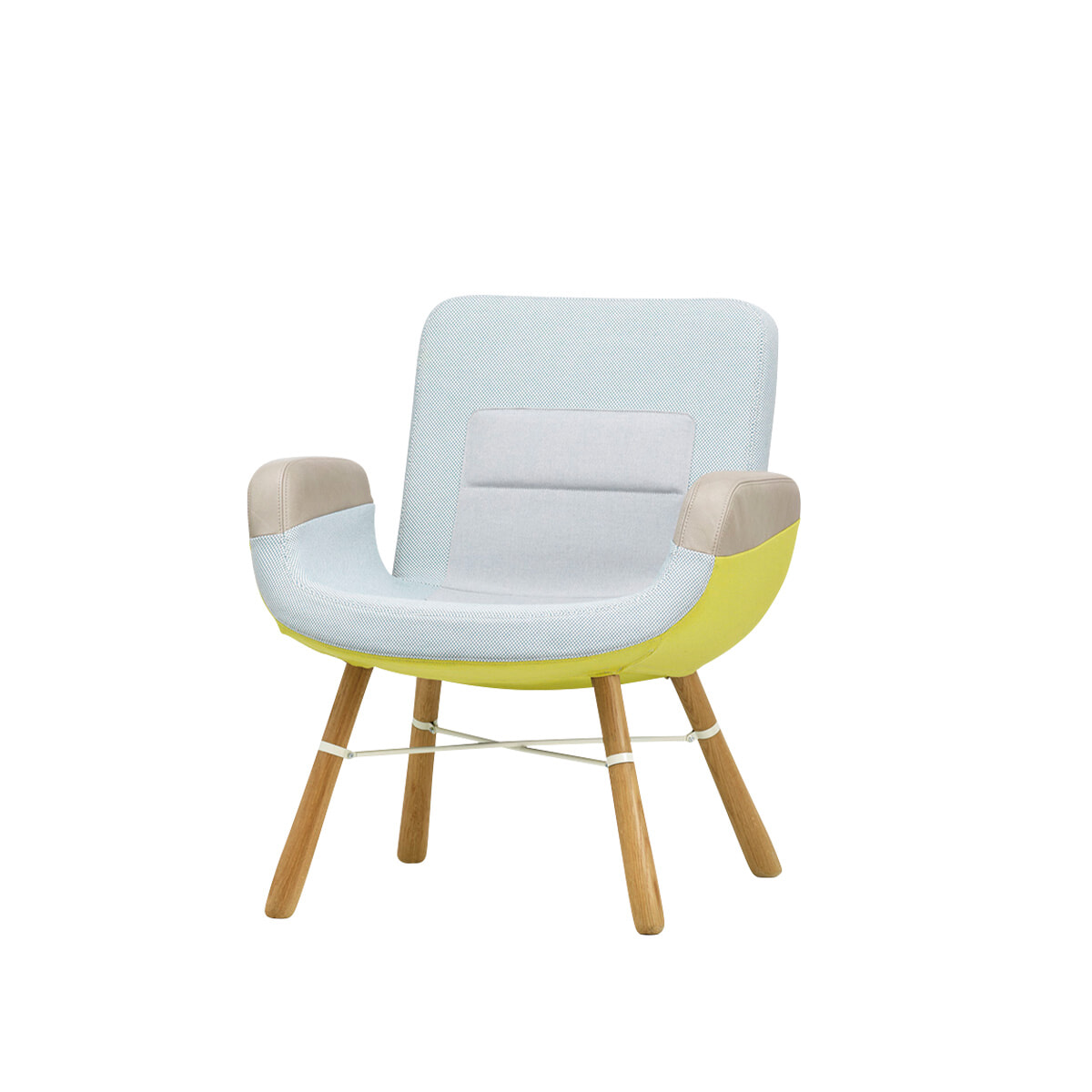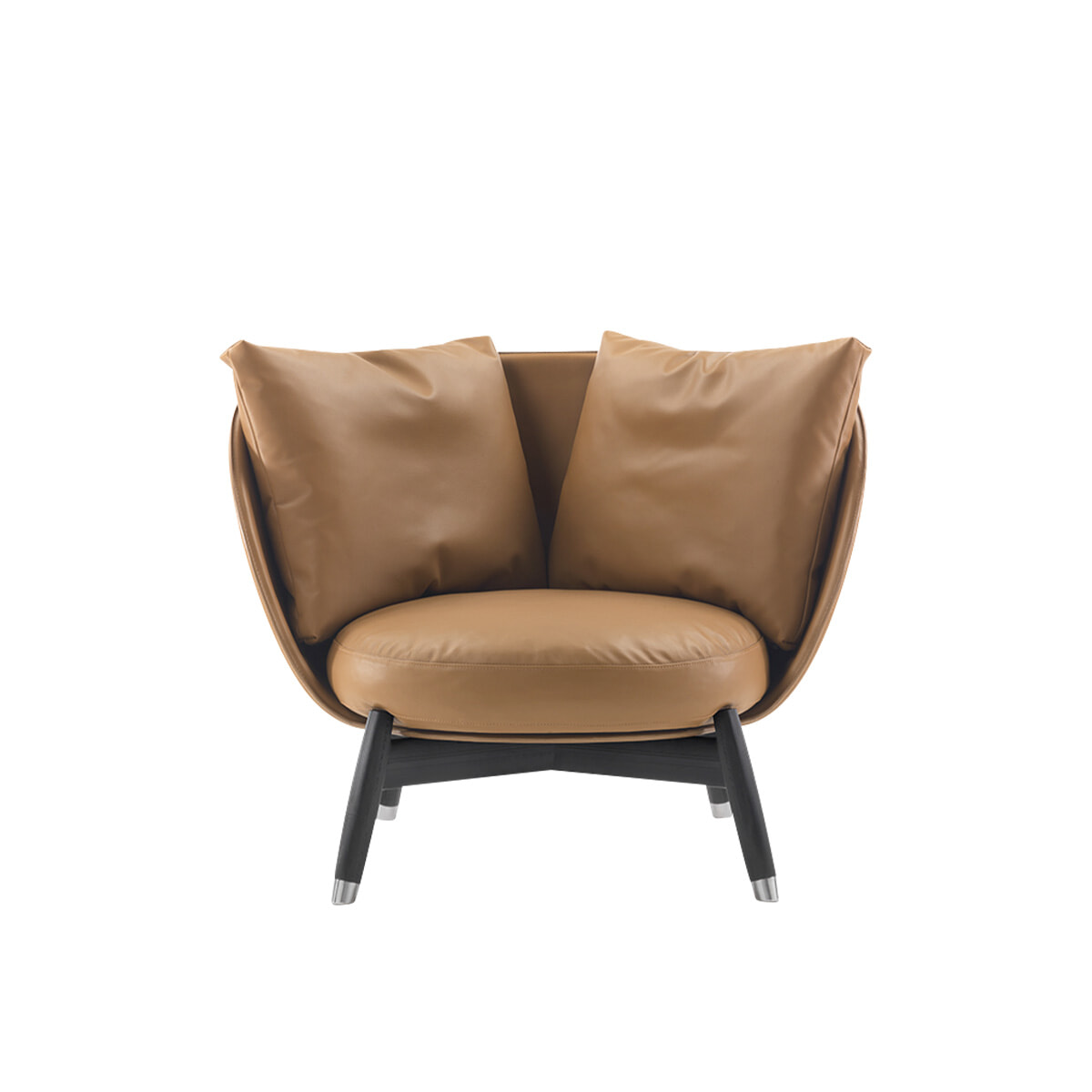 ブランケットをふわりとかけたようなシルエットが印象的。ゆったりボリューム感のある座面に対照的な細めのスチール脚を合わせ、バランスを整えた一脚。