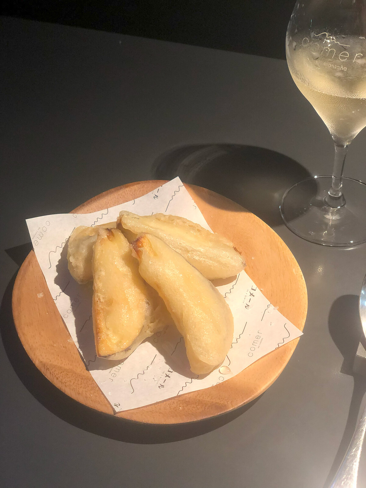 泡モノにはやっぱり揚げもの!と「きよし農園 ヘタナスのフリット」をオーダー。ヘタナスは、火を通すとトロトロになるのが特徴の加賀野菜のひとつ。地元産のハチミツがかかっているのですが、不思議とマッチ。シェフいわく、アンダルシア料理のひとつ。1カ月前にスペインを訪れていたのですが、これは知らなかった! まさか金沢で出合えるとは。甘い→しょっぱい→甘い→しょっぱい→ときどきカバ、で無限ループに陥ります。きよし農園は金沢市東荒屋町とかなり近郊にあるので、その鮮度もおいしさの秘密かもしれません。