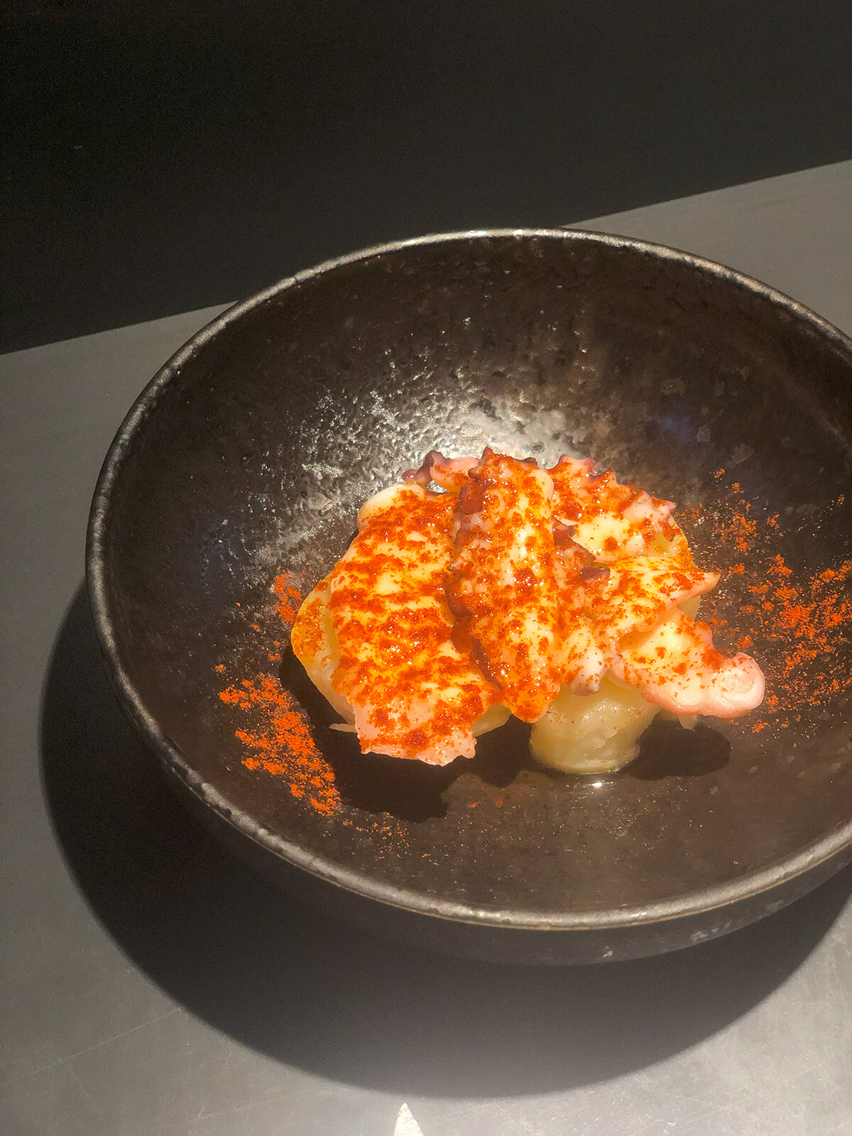 もう一品、ハーフサイズにできるタパスをとオーダーしたのが、定番「タコのガリシア風」。このメニューを見ると頼まずにはいられない衝動にかられます。メイン食材はタコとジャガイモのみとシンプルなのですが、パプリカパウダー由来のカツオ出汁のような旨味が沁みるのです。