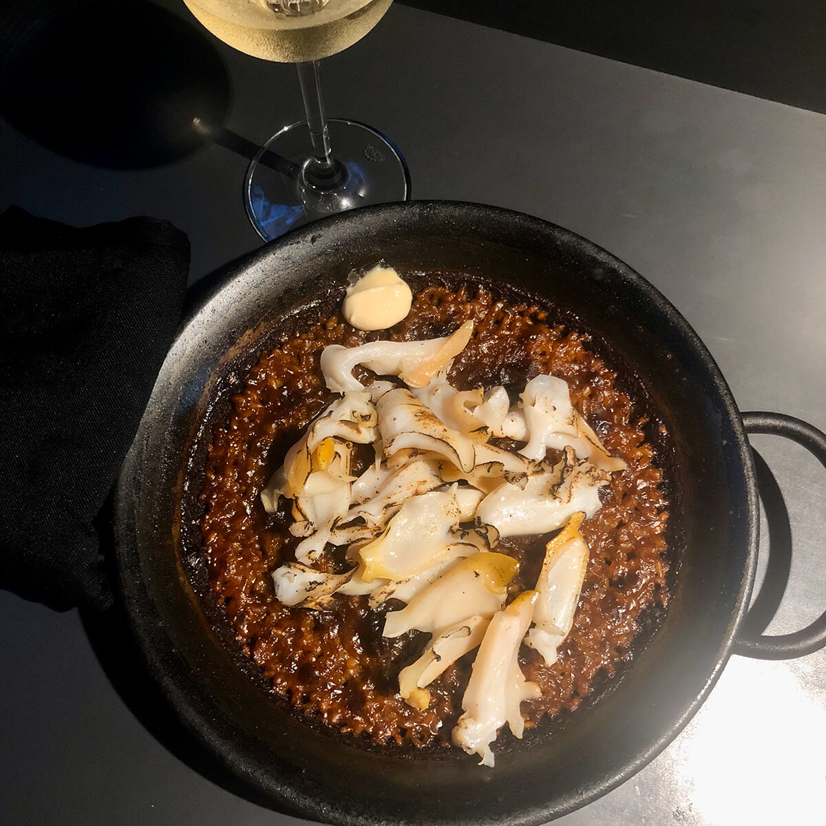 ここでお目当てのパエリアが到着! おそらくこの店を訪れるほとんどの人がオーダーするであろう人気メニューです。この日はバイ貝、白ソイ、岩牡蠣の3種から選べました。悩んだ結果、福井県産というバイ貝のパエリアに決定。サクサク歯切れよく、具材がたっぷりのっているのがまたうれしい! 鶏と豚でとった出汁が味わい深く、塩梅もちょうどいい。バルセロナを訪れた際、現地の料理の塩気にノックアウトされること多数だったので金沢スパニッシュに軍配が上がりました。