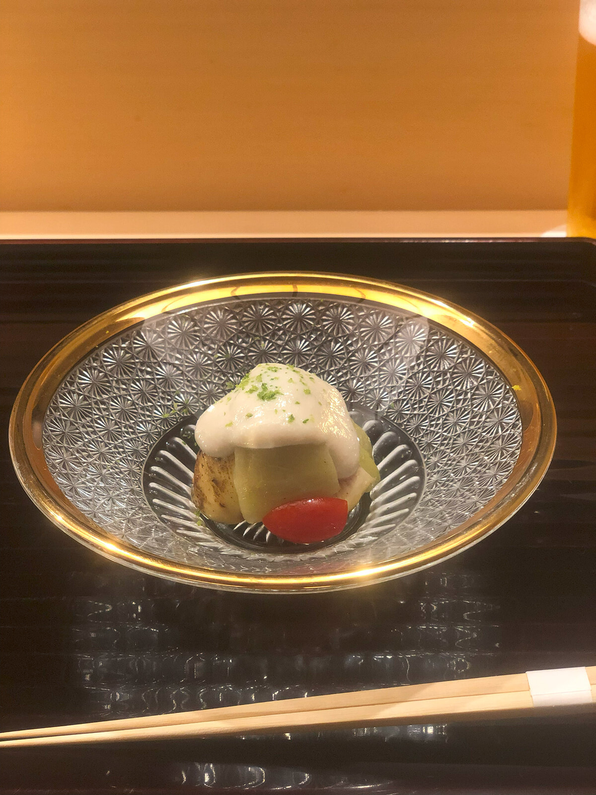 加賀棒茶の香りがするおしぼりと冷え冷えのビールで万全の準備をしたところでまず一品。「イチジクの白和え」です。福井県産のナスからじゅわっとあふれる出汁がなんともみずみずしく、そこに豆腐のコクが加わります。