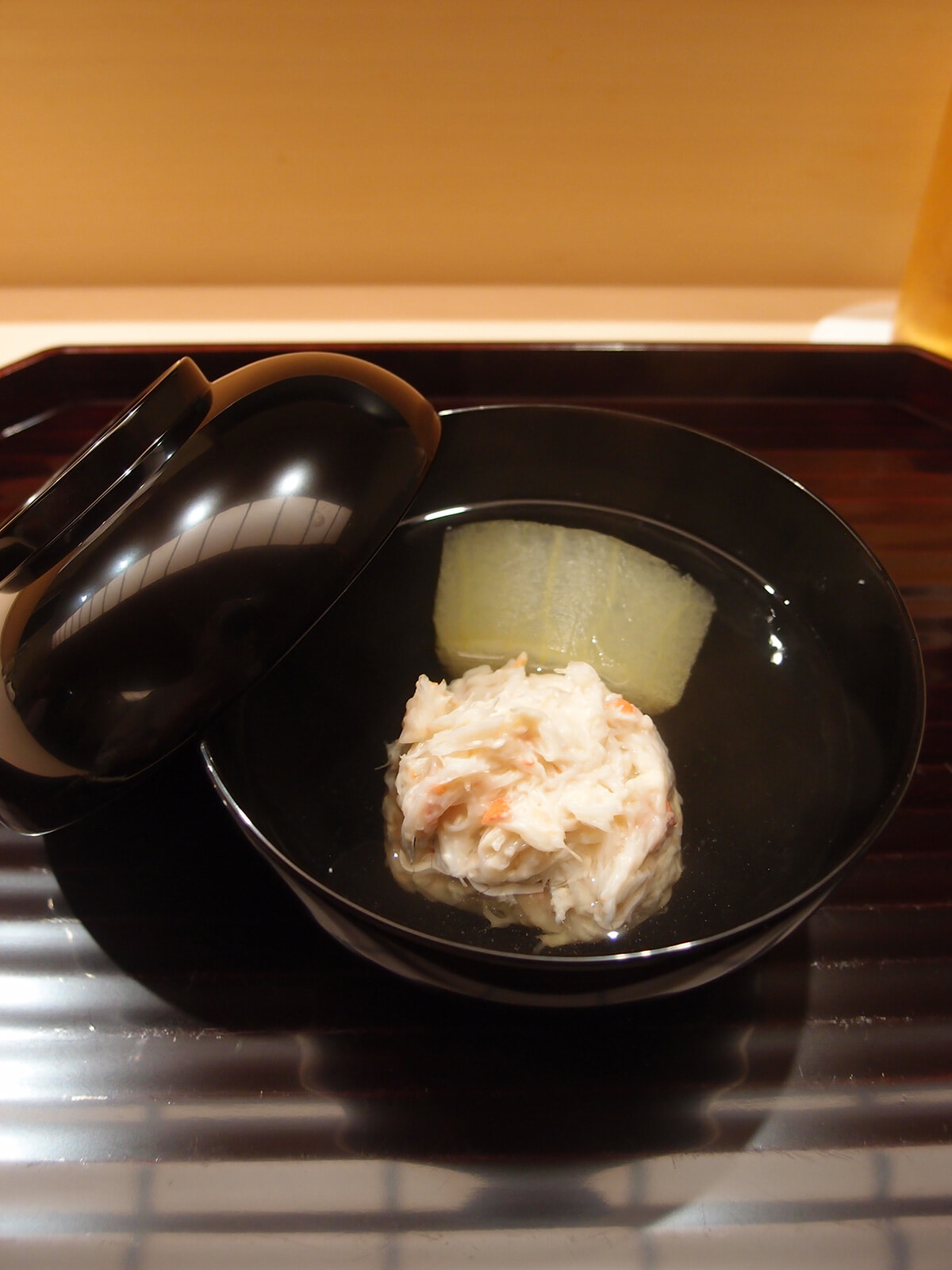 日本料理の華であるお椀には、早速魚介が登場! 「カニしんじょうとトウガン」です。つなぎをあまり感じさせないしんじょうは、輪島産紅ズワイガニの身がたっぷり。ほろほろと身がほどけるごとに、淡い味が口中に広がっていきます。出汁を吸ったトウガンも、残暑を感じさせてくれます。