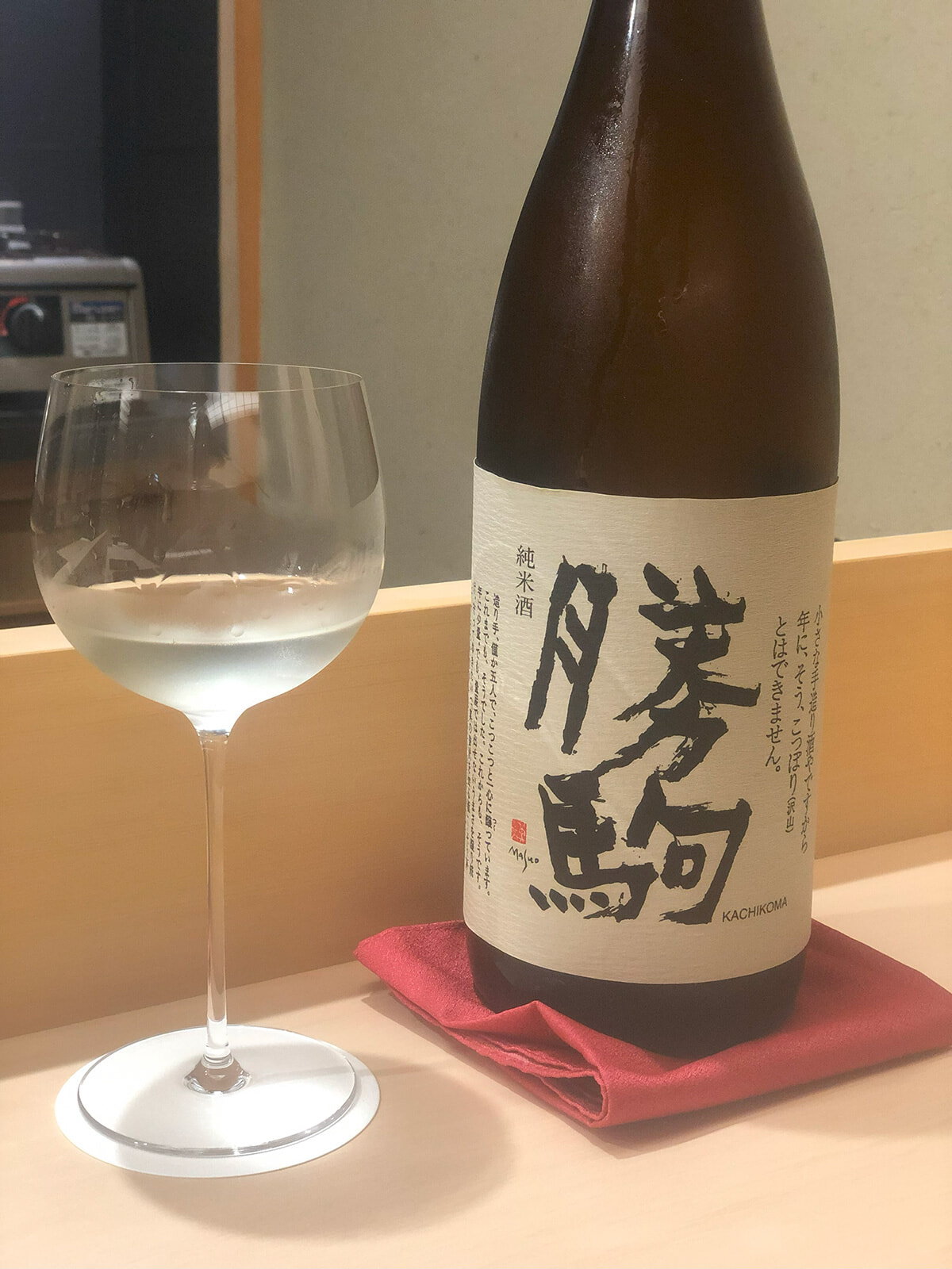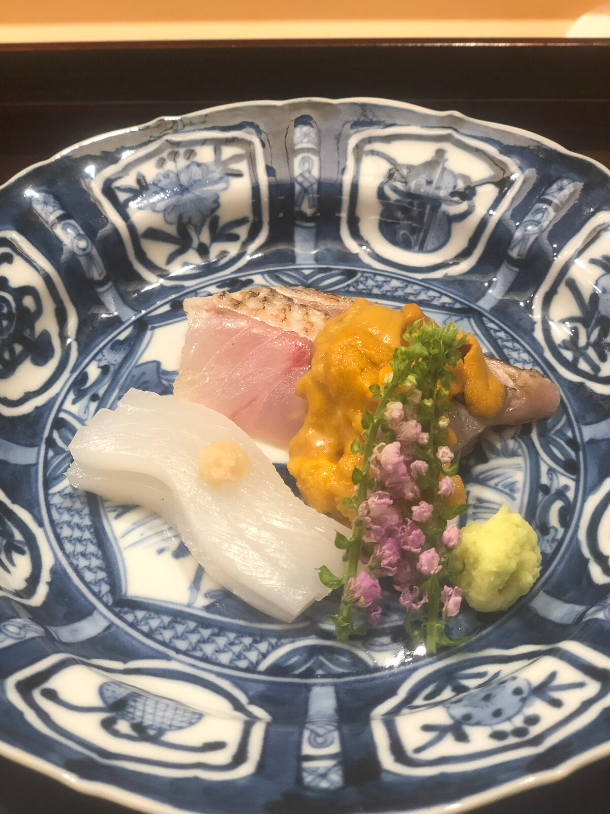 続いてお待ちかねのお造り。赤イカは能登産、皮目を炙ったノドグロは加賀産、紫ウニは余市から届いたものです。もうたまらなくなり、日本酒へ切り替え。「勝駒」は富山で造られている日本酒ですが、その澄んだ上質な水のような味わいは、ピュアな白身魚とぴったり。
