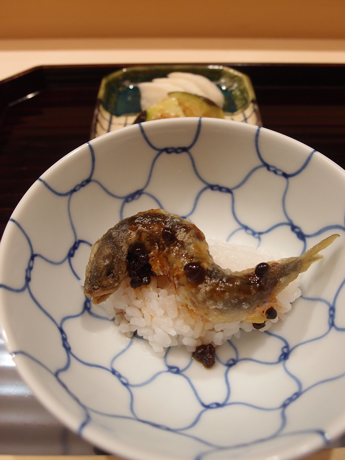 その後、小矢部川の天然スッポンの出汁を使った能登産アワビの蒸しもの、藁焼きで香り付けした和肉のパルミジャーノ添えと続き、幸せ気分で満たされたところ、土鍋で炊いたツヤツヤご飯がやってきました。ご飯だけでも十分おいしいのですが、添えられたのがアユの天ぷら! 山椒がアクセントのタレがご飯とよく合います。ご飯のおかわりができるということで、もう一膳リクエストしたところ、おともが自家製の上品な味付けのタラコとおじゃこにチェンジ。これはうれしいサプライズです。