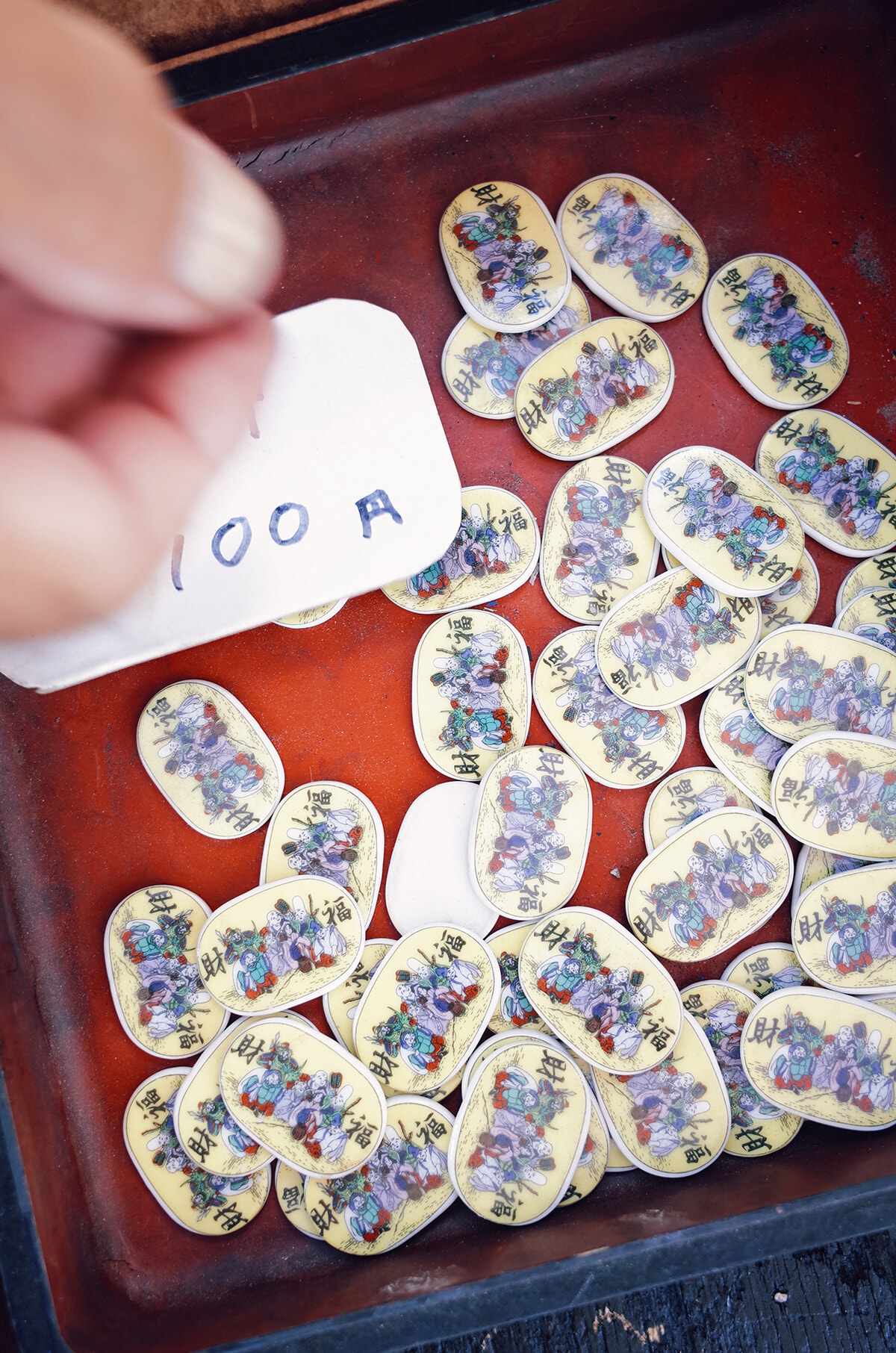 お財布に入れるといいことが起きる!と言う七福神の陶器のお守り各¥100