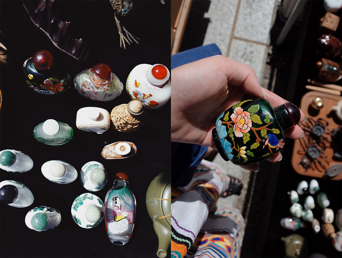 いまや作り手もいないから貴重だよ、とお店の方が教えてくれたのが、一つ一つ丁寧に職人の手によって作られたこの香水瓶。見ているだけでもうっとりします。ガラス、象牙、陶器⋯⋯ロマンがある! 特に私のお気に入りは深い赤のキャップ付きで牡丹が描かれたもの。(写真右)