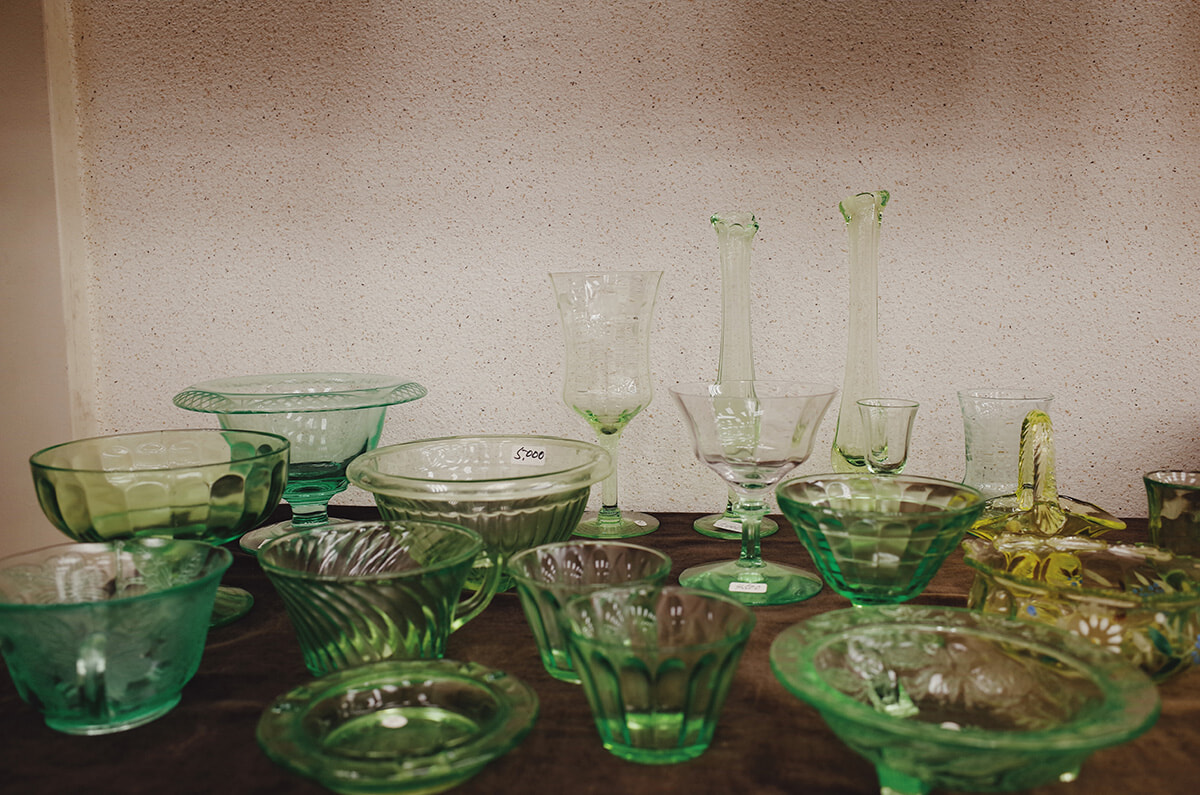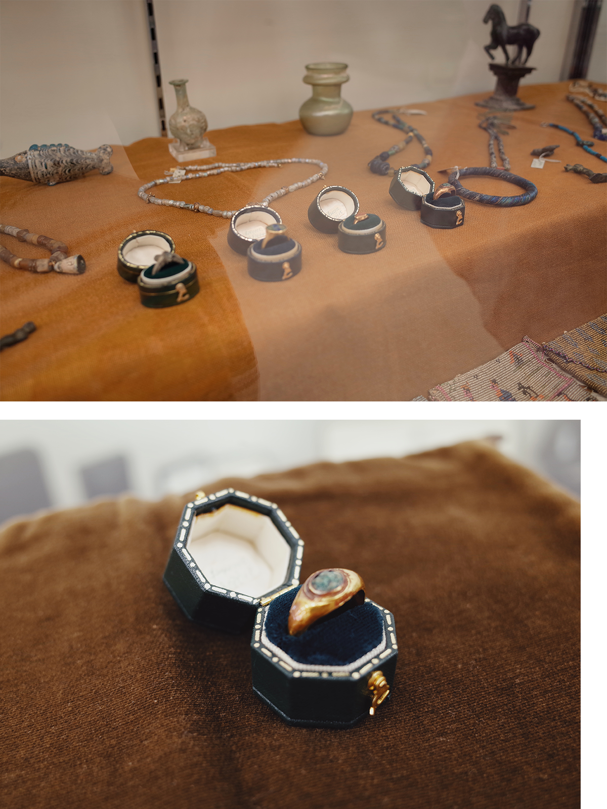 エメラルドは劣化して変色しているものの、美しさは健在。ゴールド部分が空洞になっているため、とても繊細とのこと。イギリス、イタリアで長年買付し、集めてきた商品が並ぶ。