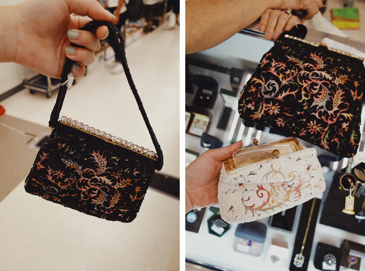 今回いちばん私の胸を射抜いたのは、間違いなくこのフランスのビーズ刺繍のバック。なんとショルダーのところにまで丁寧に刺繍が。がま口にはダイアのように輝くガラス、裏地にはシルクサテン。ああ⋯⋯アンティークって、なんて素敵なんだろう。