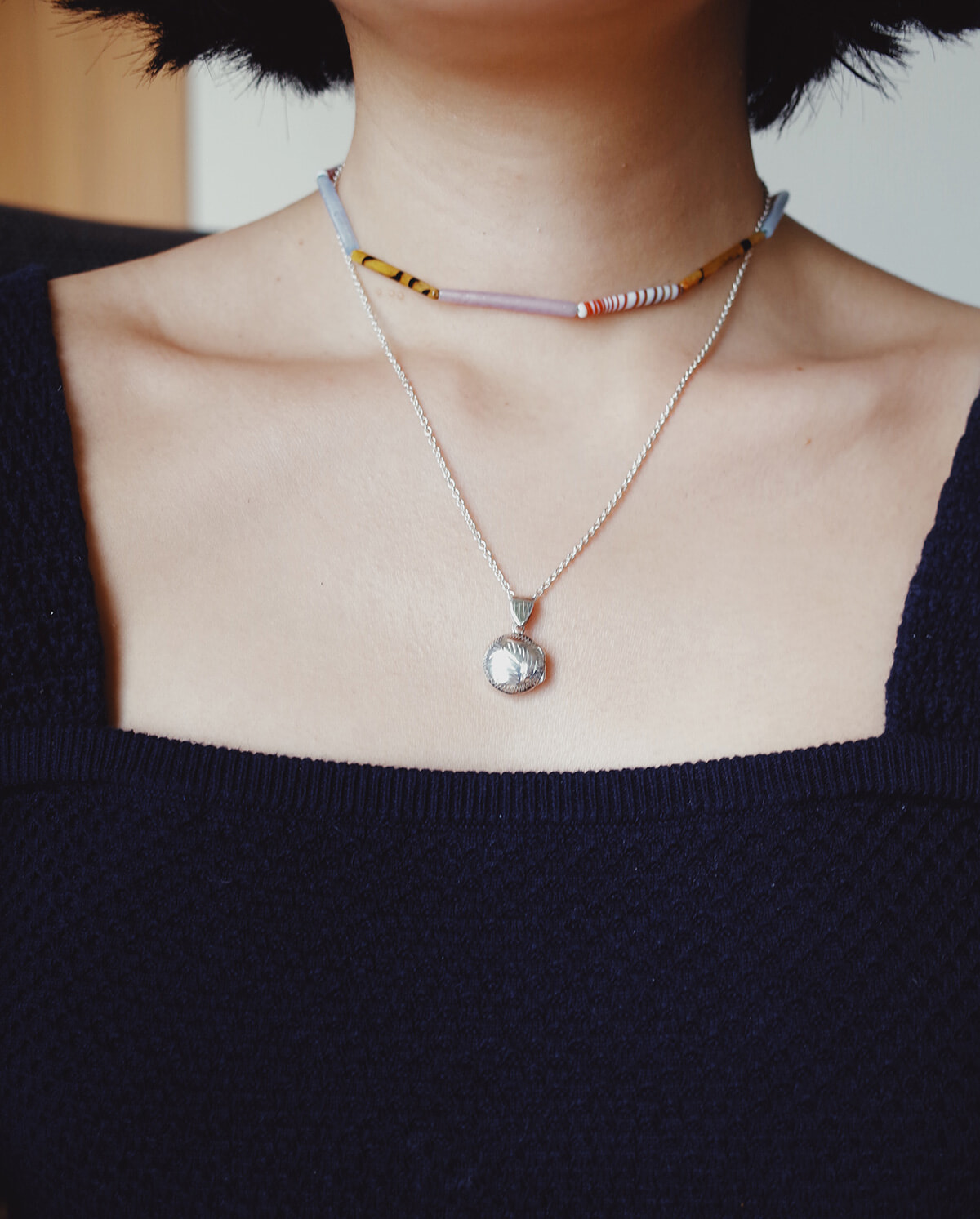 幼少期に父にロケットネックレスを買ってもらった思い出があり、またいつか買いたいなと長年思っていました。普段はゴールドしかアクセサリーは着けませんが、このシルバーは特別な気がして購入。バッグ、ネックレスともに、骨董屋山元さん(ブースは毎回B13b)にて販売。娘さんとふたりでヨーロッパを中心に買付をしているとのこと。まるでどこかのランジェリーショップみたいだな⋯⋯と思ったり。